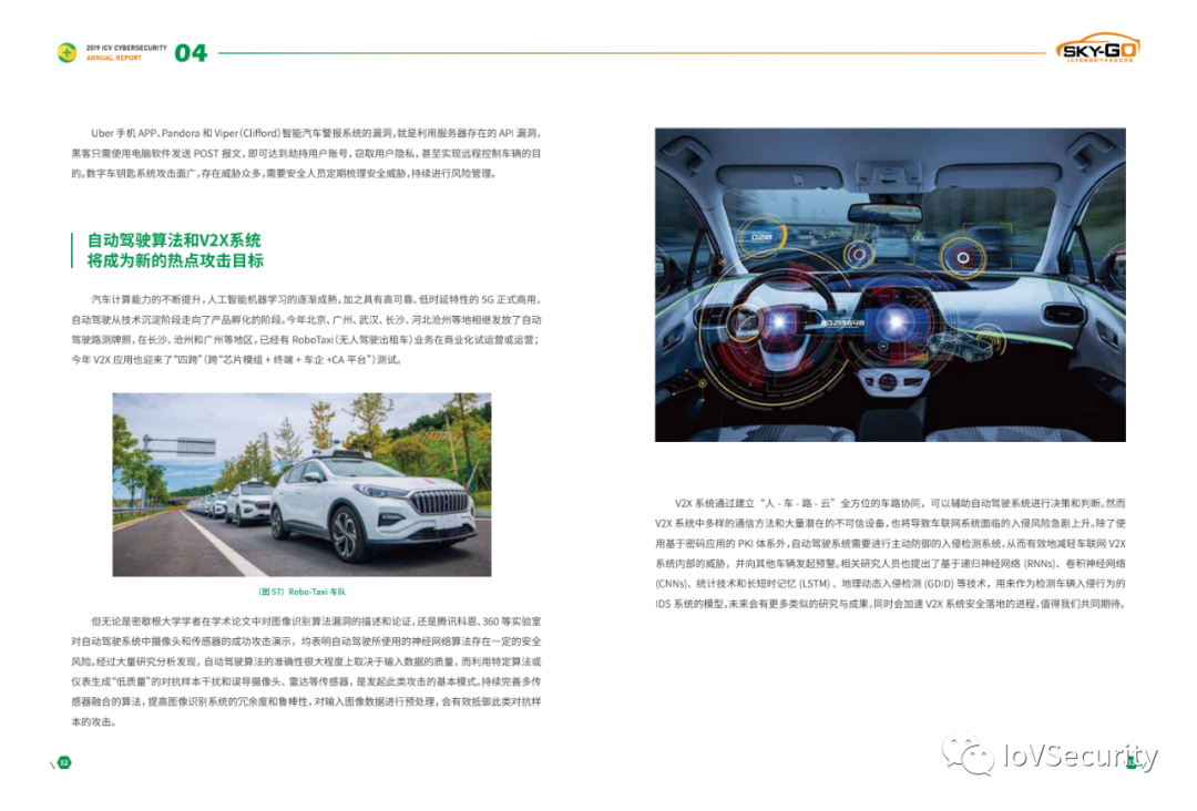 2019年,车联网出现两种新型攻击方式,基于车载通信模组信息泄露的远程控制劫持攻击以及基于生成式对抗网络的自动驾驶算法攻击,这两种新型攻击方式能够影响大部分车企。