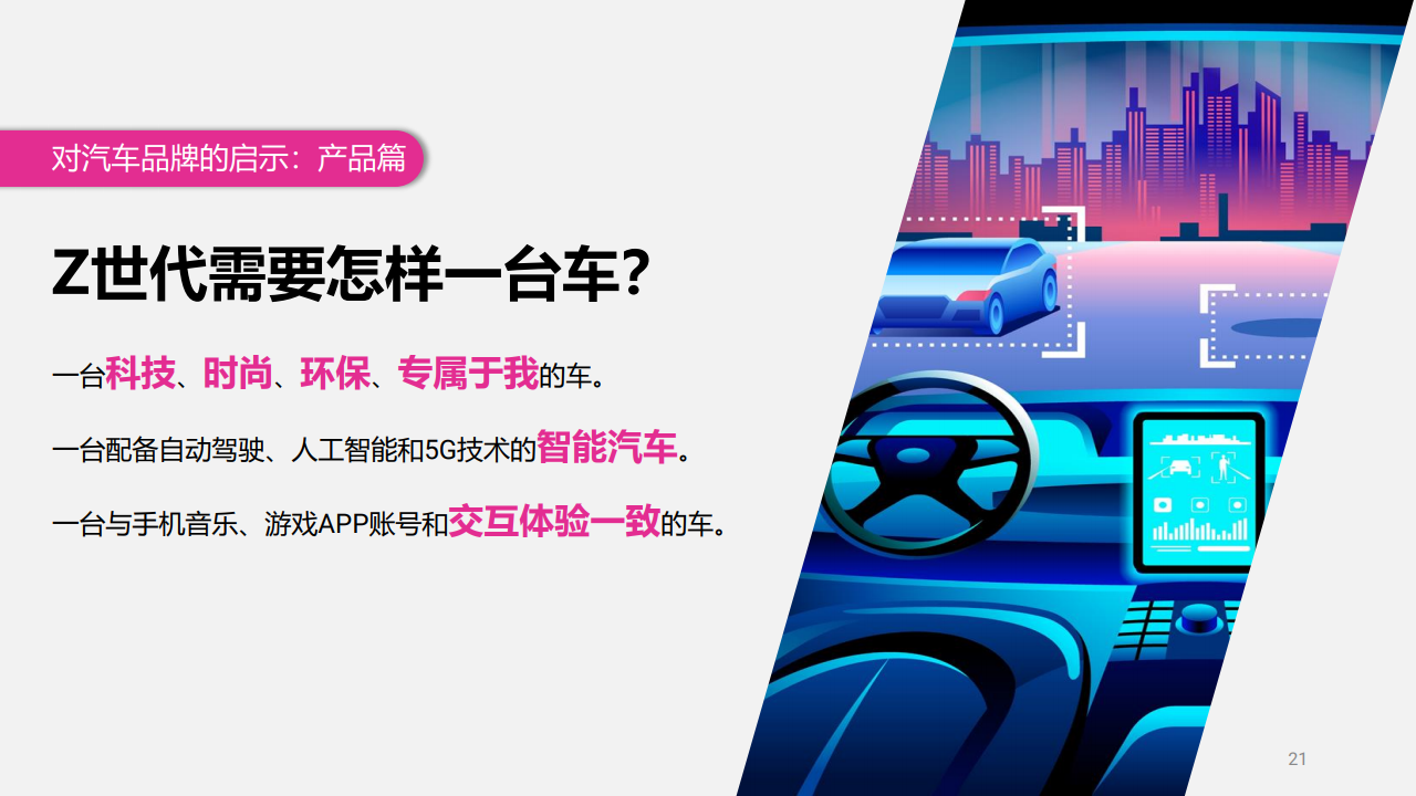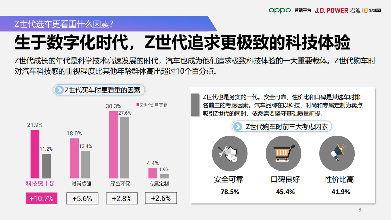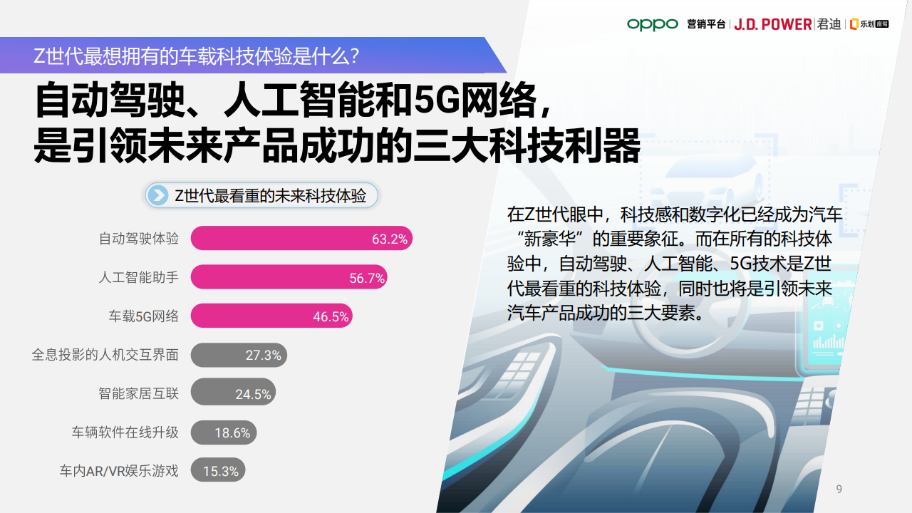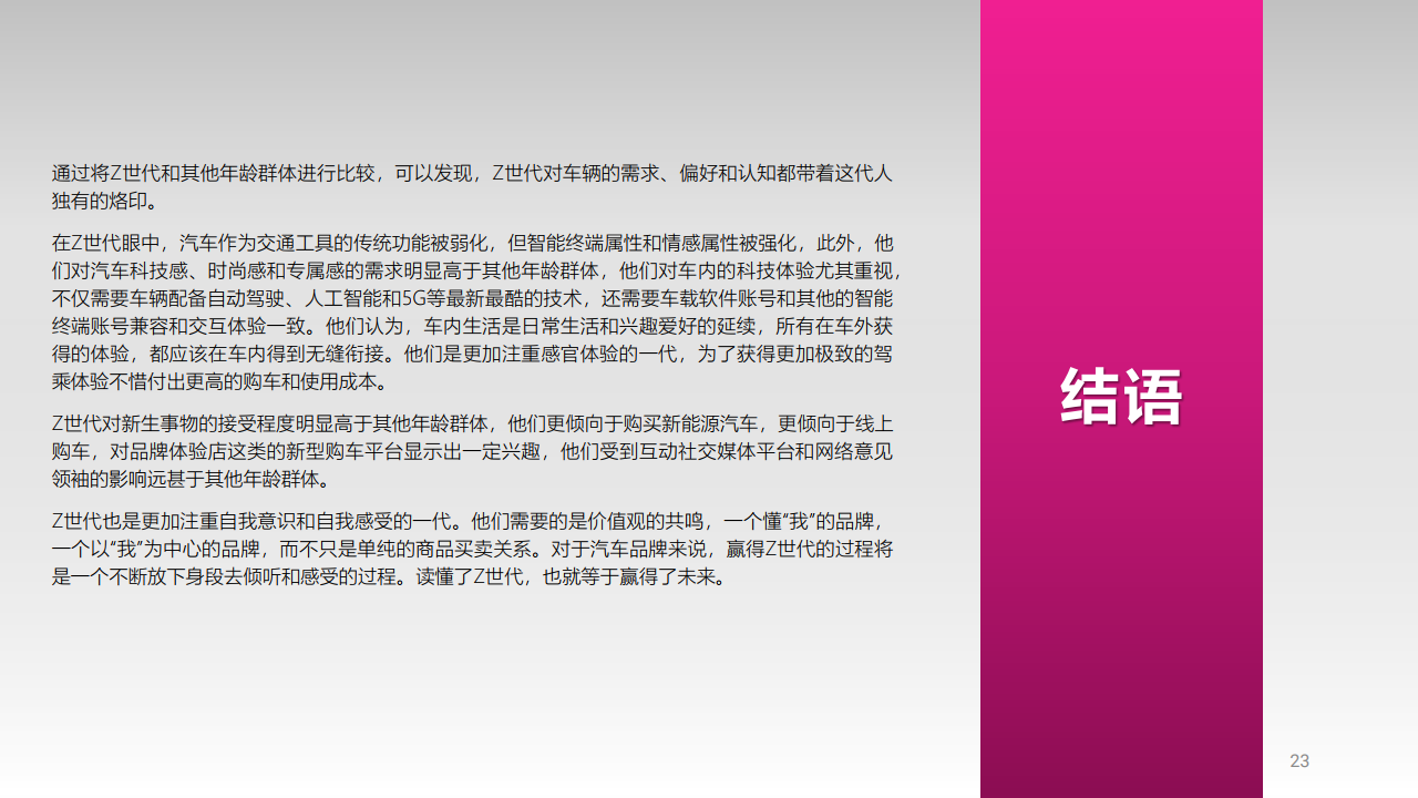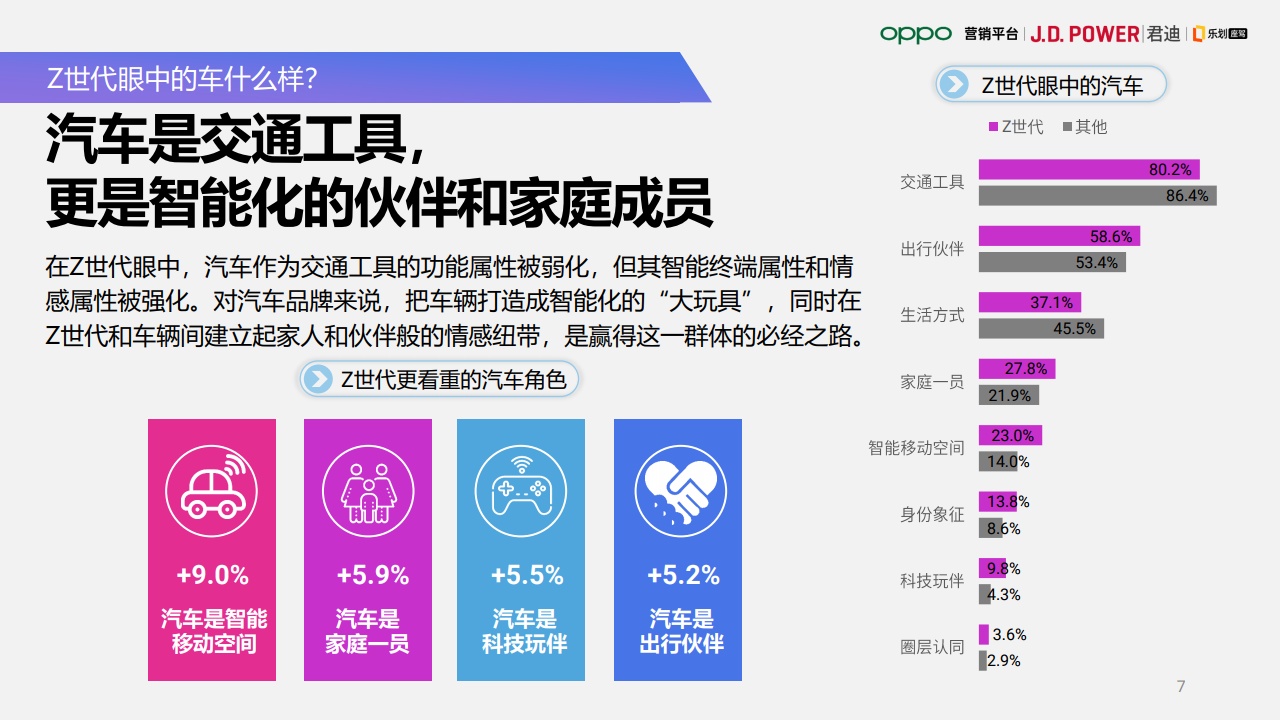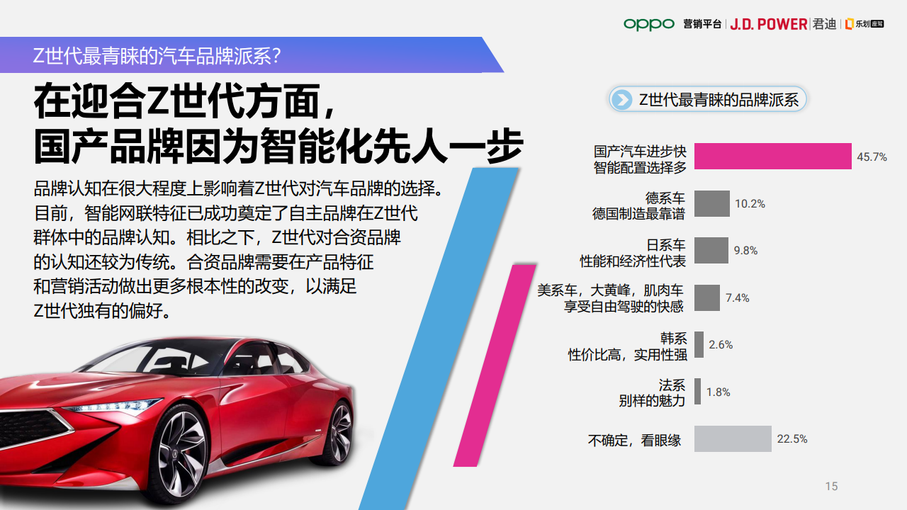 OPPO&J.D.POWER:2020中国Z世代购车倾向调查 该调查以Z世代用户为主要调查对象,通过将Z世代和其他年龄群体进行比较,重点研究了Z世代的人生态度、购车倾向与偏好等,是汽车品牌了解Z世代、赢得Z世代的重要参考。 在Z世代眼中,汽车作为交通工具的传统功能被弱化,但智能终端属性和情感属性被强化。认为汽车是智能移动空间(+9.0%)、家庭一员(+5.9%)、科技玩伴(+5.5%)和出行伙伴(5.2%)的Z世代高于其他年龄群体。 PDF版本将分享到199IT知识星球,扫描下面二维码即可! 更多阅读:Canalys:2022年Q1中国大陆手机市场出货量仅7560万台 荣耀首次登顶德勤咨询:2020中国与全球企业人工智能应用现状调研生生不息:Z世代与财会行业的未来报告OK Zoomer:Z世代群体调查报告报告:Z世代即将成年–21岁!无国界的一代:拥抱Z世代消费者Z世代报告:揭示如何制定赢得Z世代的移动策略Morning Consult:理解Z世代JWT报告:了解Z世代Z世代报告:无界限的一代中国旅游研究院:2020中国冰雪旅游发展J.D.Power:2021年中国汽车市场魅力指数J.D.Power:2021年中国汽车智能化研究 国产车碾压合资品牌J.D.Power:2021年中国汽车销售满意度排名 豪华车林肯第一J.D.Power:2020中国汽车销售满意度研究