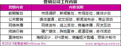 电影的营销工作自筹拍制片起便已展开,包括发行、上映及映后口碑皆需营销公司的参与贯穿始终。在影片筹拍期间,影视营销公司针对市场与受众定位后发布营销计划。影片制作期间,营销侧重于媒体公关以及剧照和物料的发布。影片上映前期,电影营销正式进入密集宣传期,网络与线下彼此呼应。而影片上映后,营销公司负责口碑与舆论向导,带动话题点,力求影片讨论热度达到最高。