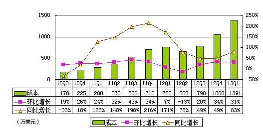 奇虎360第一季度营业成本为1391万美元,比去年同期的761万美元增长82.7%,比去年第四季度的1065万美元增长30.6%。