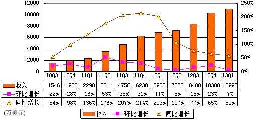 2013年第一季度收入约为1.10亿美元,比去年同期的6928万美元增长约58.6%,比上季度的1.03亿美元增长为6.7%。同比和环比的增长主要由于在线广告业务和互联网增值服务业务的持续强劲的增长。