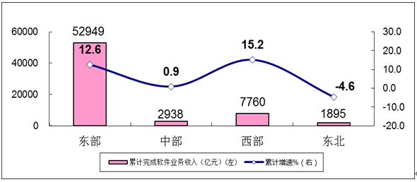 西部地区软件业收入增速保持领先。1-10月,东部地区完成软件业务收入52949亿元,同比增长12.6%。中部地区完成软件业务收入2938亿元,同比增长0.9%。西部地区完成软件业务收入7760亿元,同比增长15.2%。东北地区完成软件业务收入1895亿元,同比下降4.6%,四个地区软件业务收入在全国总收入中的占比分别为:80.8%、4.5%、11.8%和2.9%。