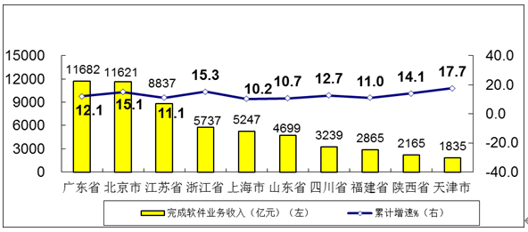主要软件大省业务收入增速持续回升。1-10月,软件业务收入居前5名的省份中,广东、北京、江苏、浙江和上海软件收入为分别为11682亿元、11621亿元、8837亿元、5737亿元和5247亿元,分别增长12.1%、15.1%、11.1%、15.3%和10.2%,分别较1-9月提高0.7个、0.6个、3.6个、0.7个和0.6个百分点,五省市合计软件业务收入占全国比重为65.8%。