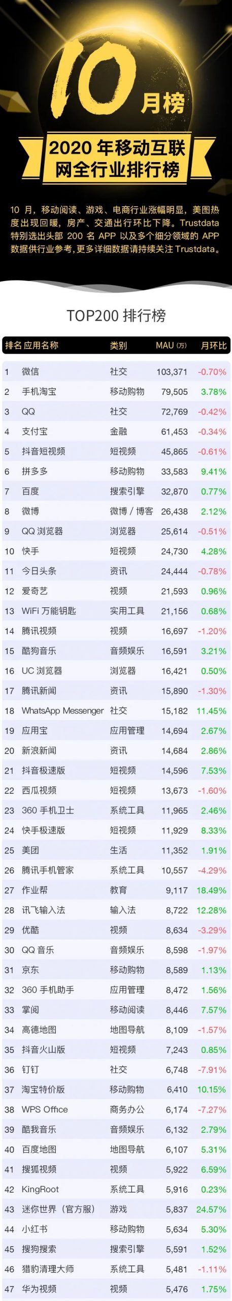 Trustdata:2020年10月移动互联网全行业排行榜 更多阅读:Trustdata:2019年7月移动互联网全行业排行榜Trustdata:2020年7月移动互联网全行业排行榜Trustdata:2020年8月移动互联网全行业排行榜Trustdata:2019年12月移动互联网全行业排行榜Trustdata:2020年6月移动互联网全行业排行榜TrustData:2018年7月移动互联网全行业排行榜Trustdata:2019年6月移动互联网全行业排行榜Trustdata:2019年3月移动互联网全行业排行榜Trustdata:2018年10月移动互联网全行业排行榜Trustdata:2020年9月移动互联网全行业排行榜Trustdata:2020年4月移动互联网全行业排行榜Trustdata:2019年1月移动互联网全行业排行榜Trustdata:2018年8月移动互联网全行业排行榜Trustdata:2021年5月移动互联网全行业排行榜Trustdata:2022年8月移动互联网全行业排行榜