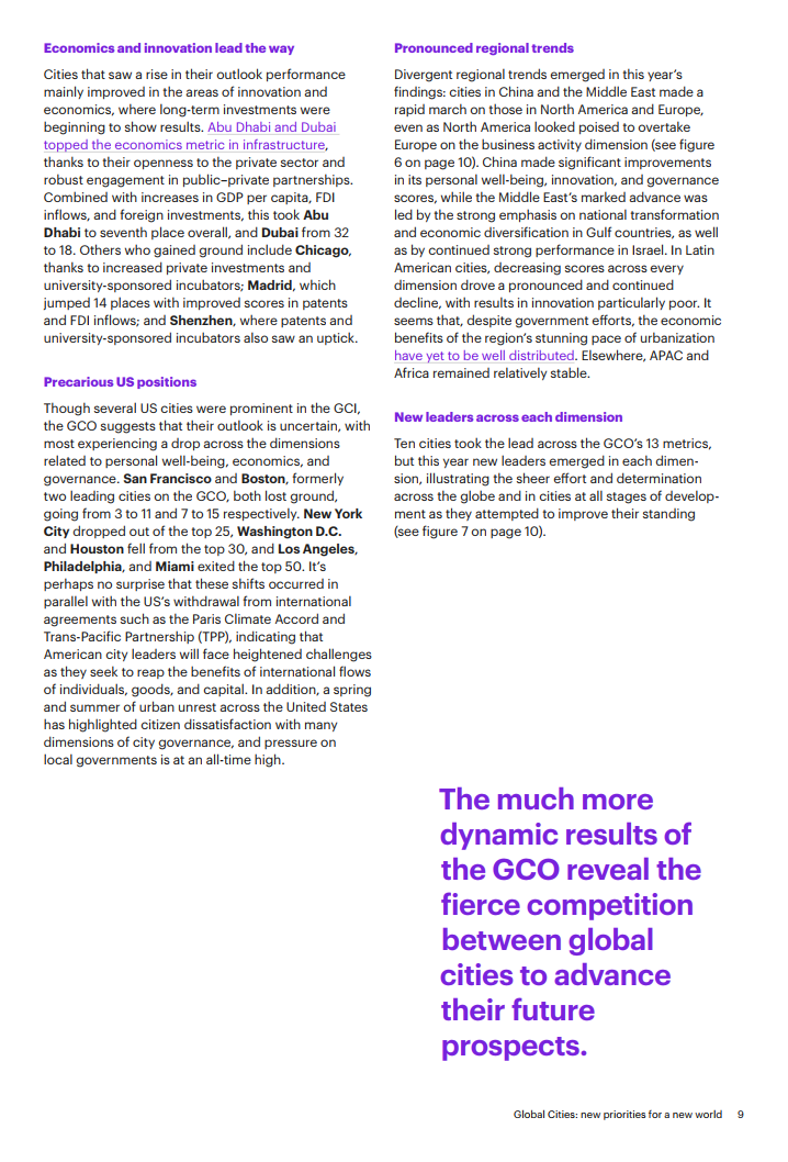 潜力城市排名的上升都得益于其在治理和经济发展方面的长期投入,特别是中国和中东城市,它们正在快速追赶欧洲和北美城市。