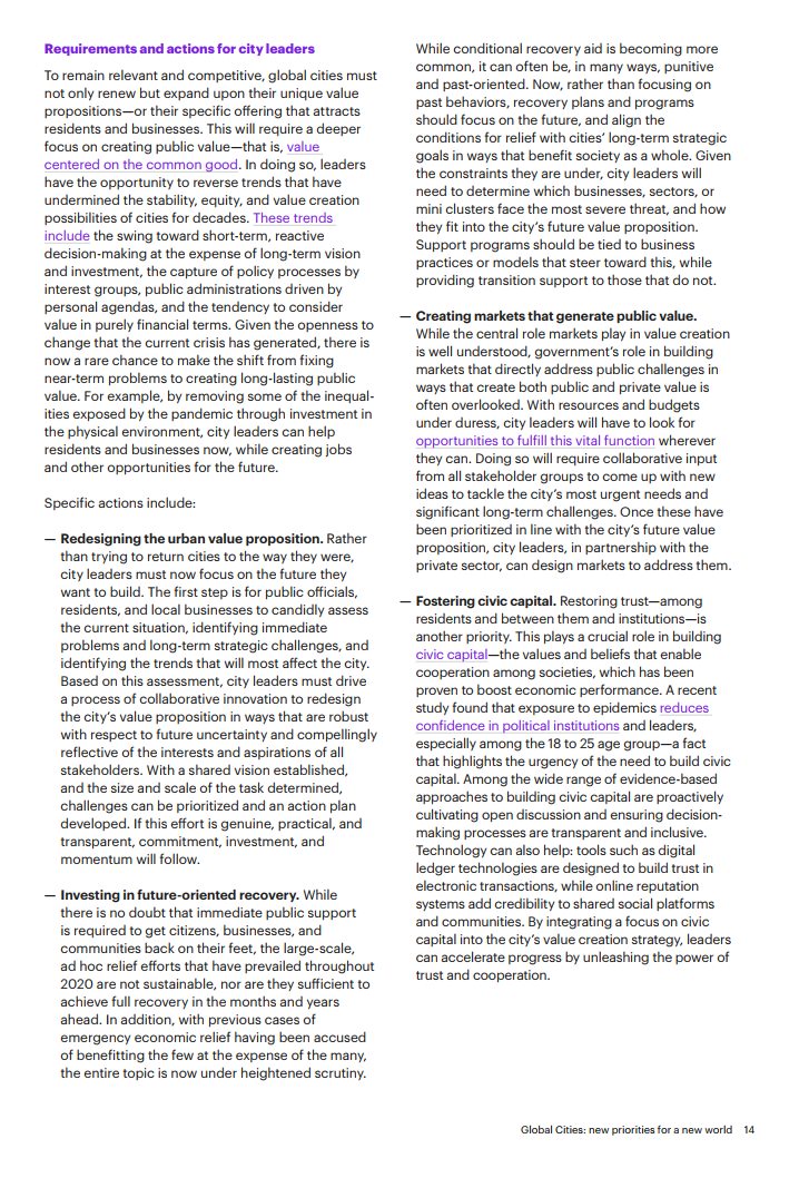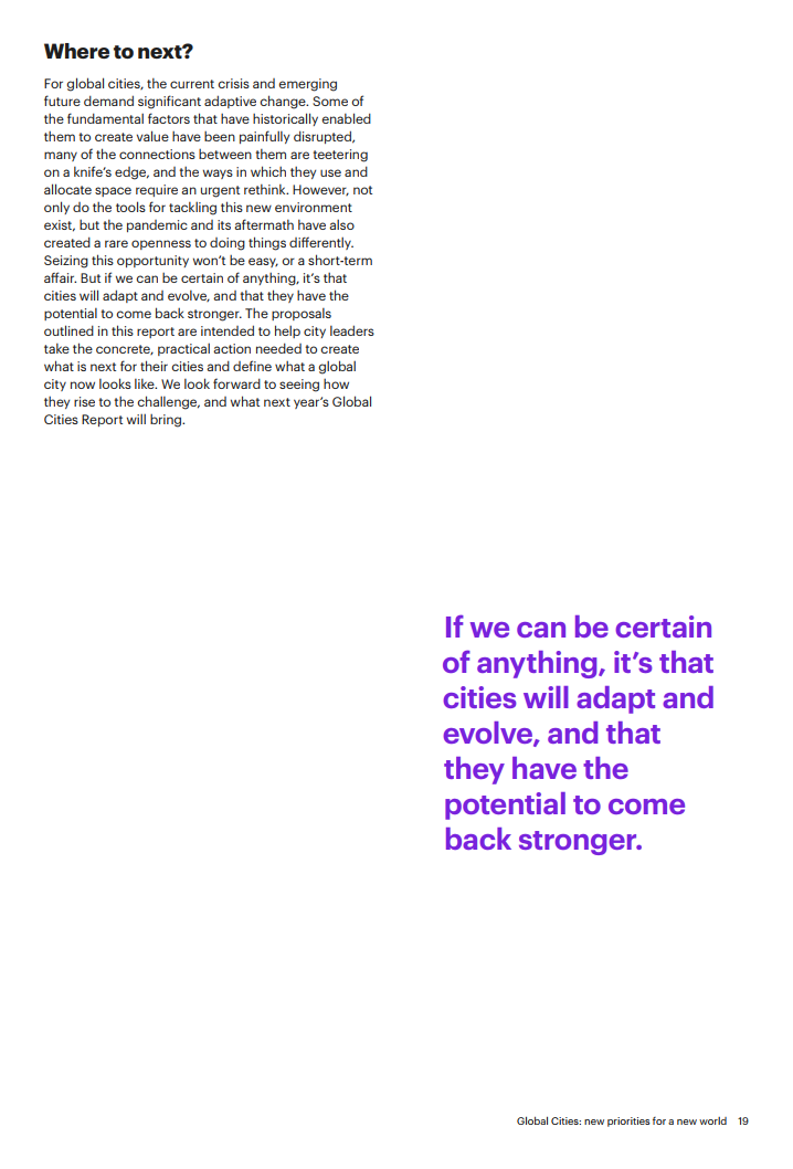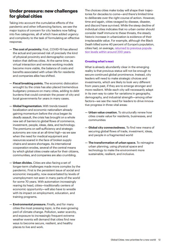 新冠疫情是一个决定性的转折点,这次疫情加剧了一些原本已经给城市带来巨大压力的问题,包括财政压力、贫富差距,逆全球化和环境危机。应对这些挑战,城市领导者需要重新思考许多长期以来存在的假设和发展重点。