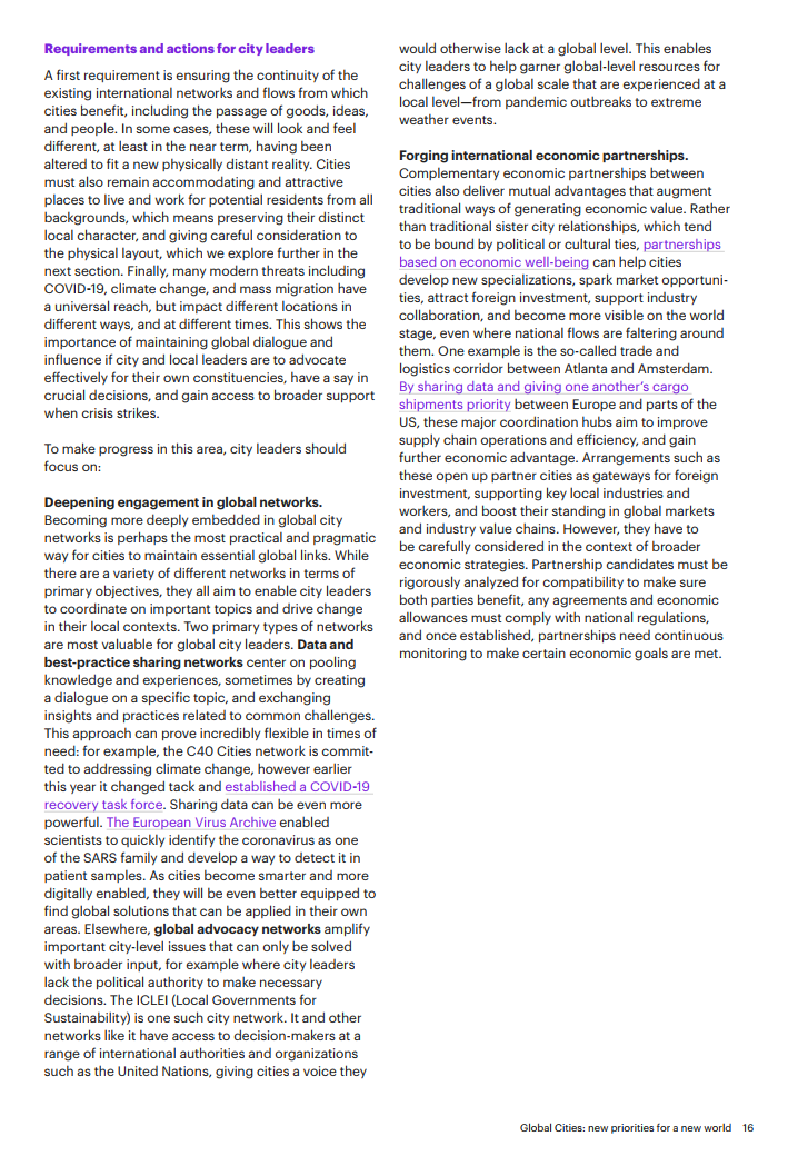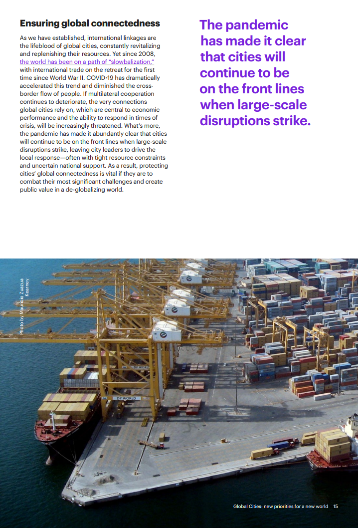其次,加强城市互联互通。国际商品流通、思想交流、人员流动和资金融通对城市发展至关重要,但这些要素的流动现在受到疫情短期影响和国际秩序逆全球化长期趋势的双重威胁。面临日益严峻的国际形势,城市领导者需竭力恢复和扩大与全球其他城市的联系,维持关键要素的流动。