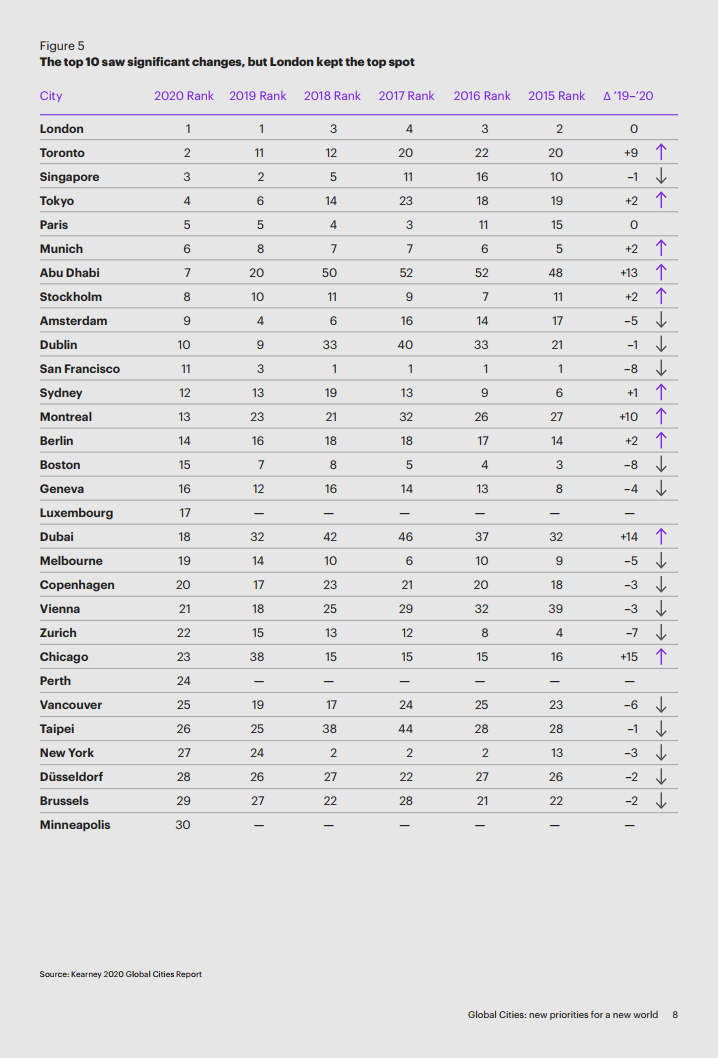 2020年《全球城市潜力排名》变化更加明显。虽然伦敦仍居榜首,但其他大多数城市的排名都发生了较大变化,比如多伦多排名上升九位,跃居第2名,主要得益于创新水平的大幅提升和治理的持续改善。东京排名上升两位,现居第4名,居民幸福感持续多年拿到高分。阿布扎比排名上升十三位,跃居第7名,主要得益于推动经济效益和多元化发展的长期投资。