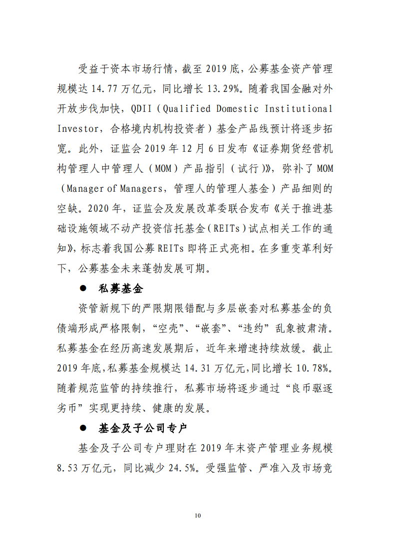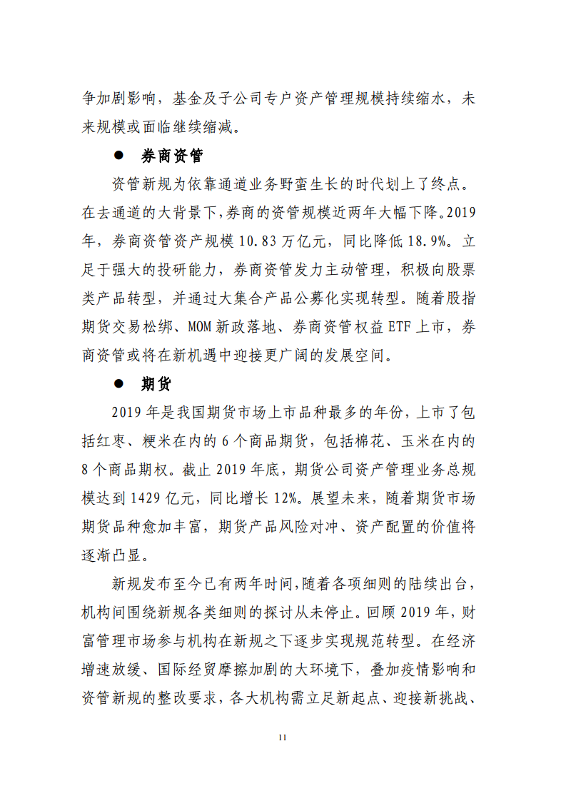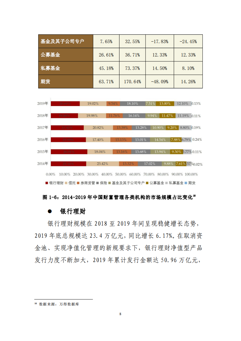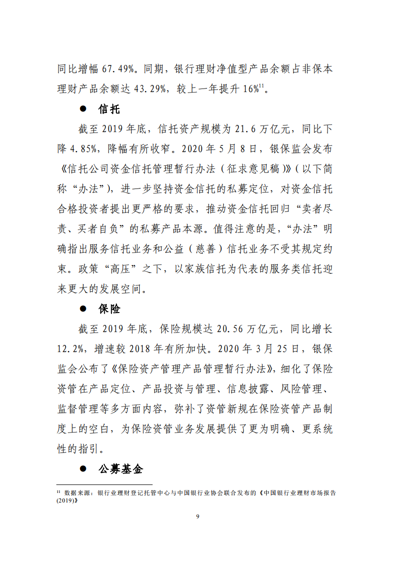 在财富管理行业的供给端,银行理财、保险、信托、基金专户、券商资管、公募基金、私募基金和期货等大类资产经历了不同程度的调整,资管业务逐步回归本源,发展态势稳健。截至2019年底,我国银行理财总规模达23.4万亿元,同比增长6.17%;信托资产规模为21.6万亿元,同比下降4.85%;保险规模达20.56亿元,同比增长12.2%;公募基金资产管理规模达14.77万亿元,同比增长13.29%;私募基金规模达14.31万亿元,同比增长10.78%;基金及子公司专户理财规模8.53万亿,同比减少24.5%;券商资管资产规模10.83万亿元,同比降低18.9%;期货公司资产管理业务总规模达到1429亿元,同比增长12%。