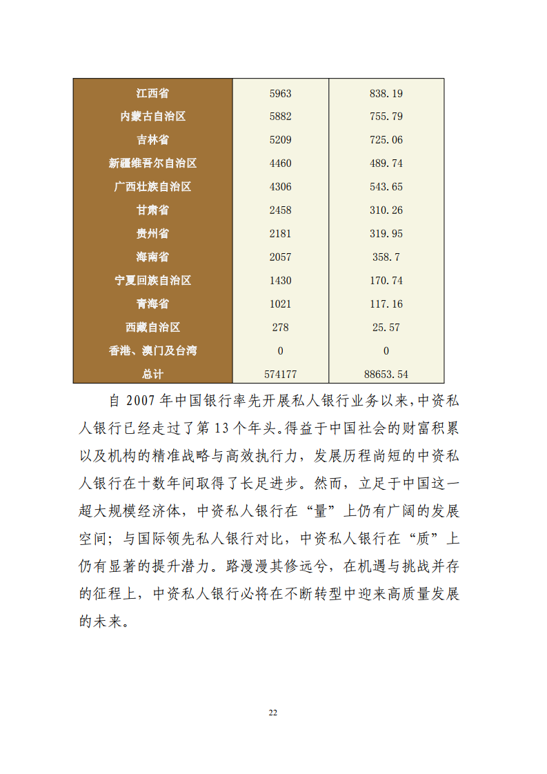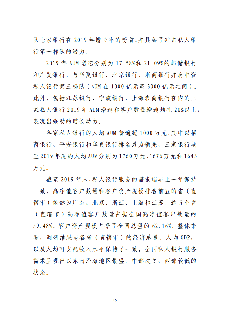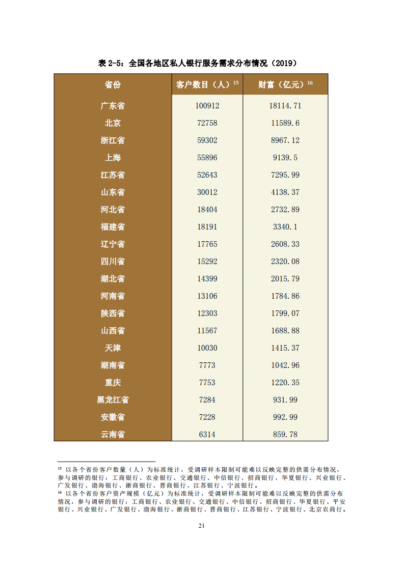 中资私人银行的总体资产管理规模(AUM)从2018年的12.20万亿元,增至2019年的14.12万亿元,增长率达15.75%。私人银行客户数从2018年的86.69万人,增至2019年的103.14万人,增长率达18.96%。处于中资私人银行第一梯队、资产管理规模超过1万亿元的工商银行、农业银行、中国银行、建设银行和招商银行等5家银行继续保持行业领军地位。截至2019年底,私人银行服务的需求端与上年保持一致,高净值客户数量和客户资产规模排名前五的省(直辖市)依然为广东、北京、浙江、上海和江苏。这五个省(直辖市)的高净值客户数量和资产管理规模约占全国总量的六成。