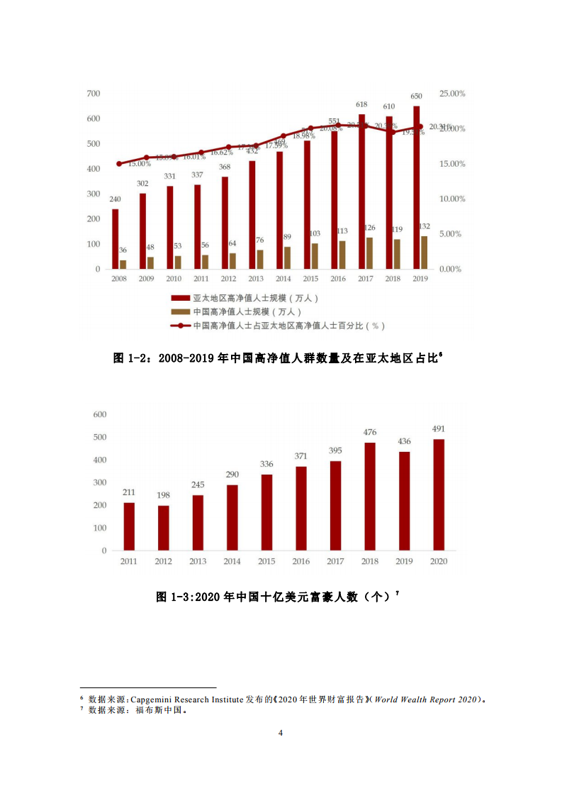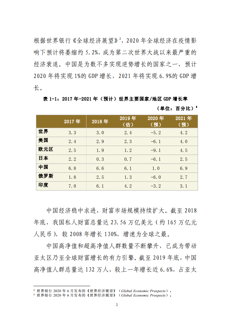 2019年以来,全球经济增长放缓,国际地缘政治复杂化,全球经济发展环境的不确定性增加。在新型冠状病毒肺炎疫情以及各国财政、货币政策的刺激下,全球风险资产大幅波动。尽管受到疫情冲击,中国经济呈现出强大的韧性和复苏能力,成为2020年为数不多实现逆势增长的国家之一,财富市场规模持续扩大。截至2019年底,中国高净值人群总量达132万人,较上一年增长近6.6%,成为带动亚太区乃至全球财富增长的有力引擎。