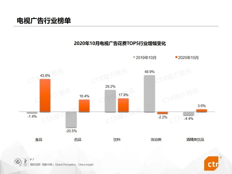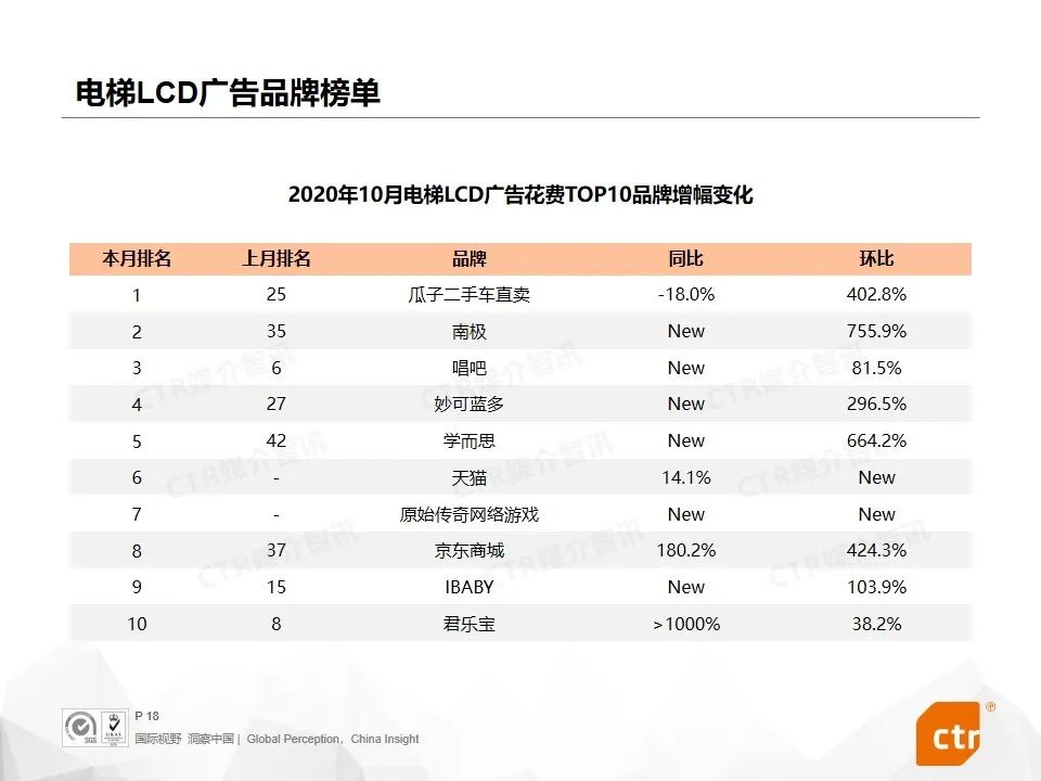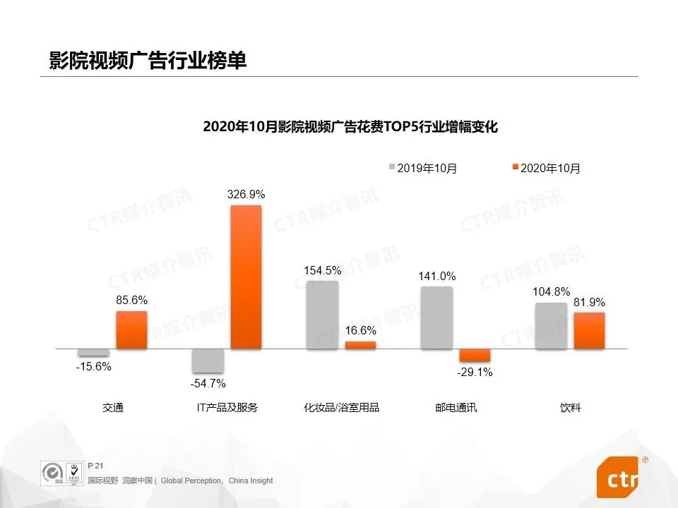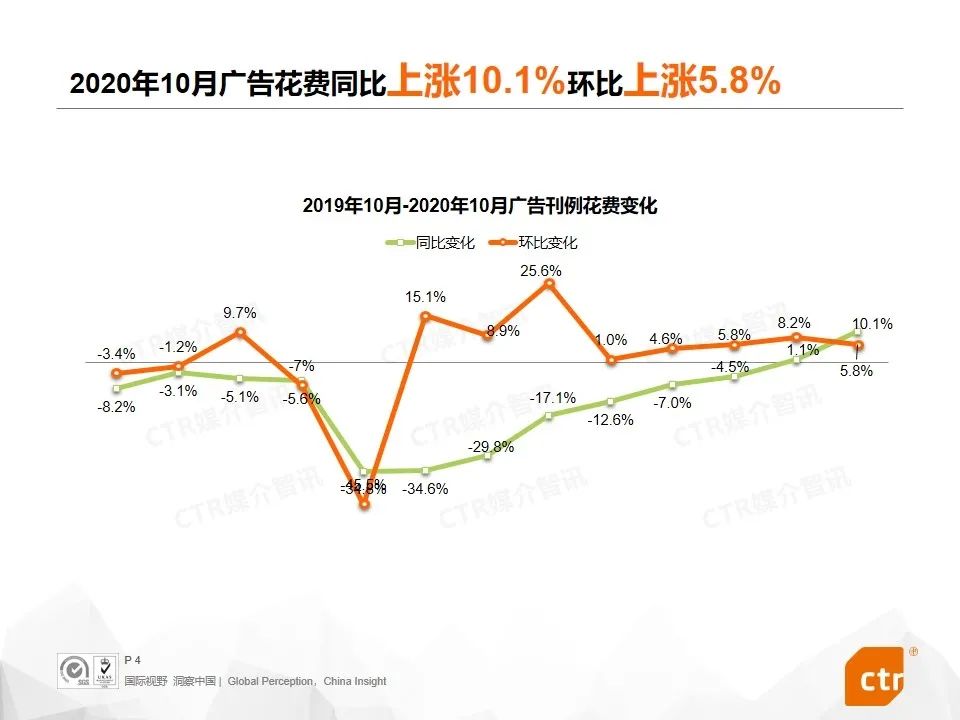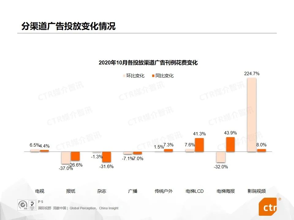 根据CTR媒介智讯的数据显示,2020年10月广告市场花费同比和环比迎来双增长,同比提升10.1%,环比提升5.8%。这是继9月份同比环比达到双增长之后,第二个月呈现增长趋势。其中,多个广告渠道表现良好,电视广告同比提升4.4%,传统户外广告同比增长7.3%,电梯广告花费同比增长均超过40%,影院广告随着全国影院的逐步开放,投放量同比已经回归正增长为8.0%。