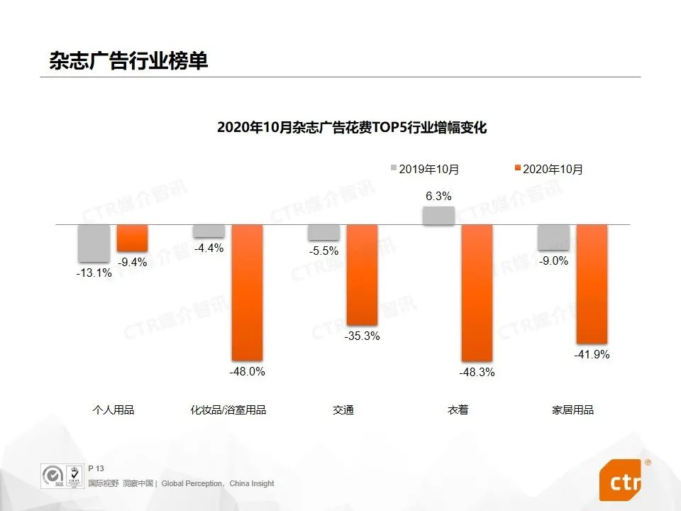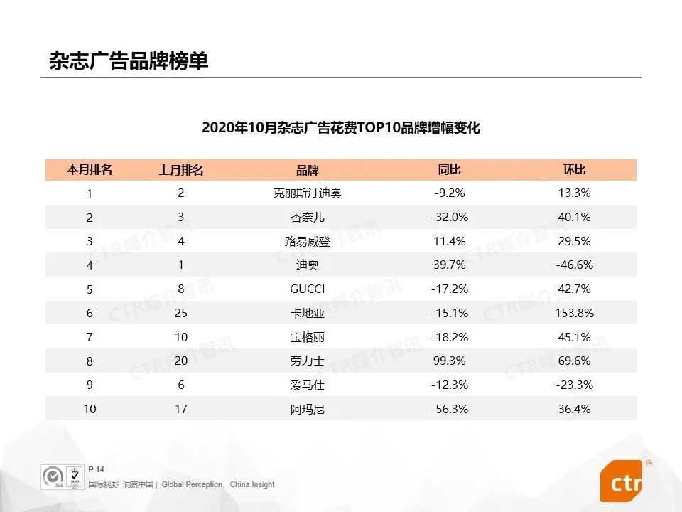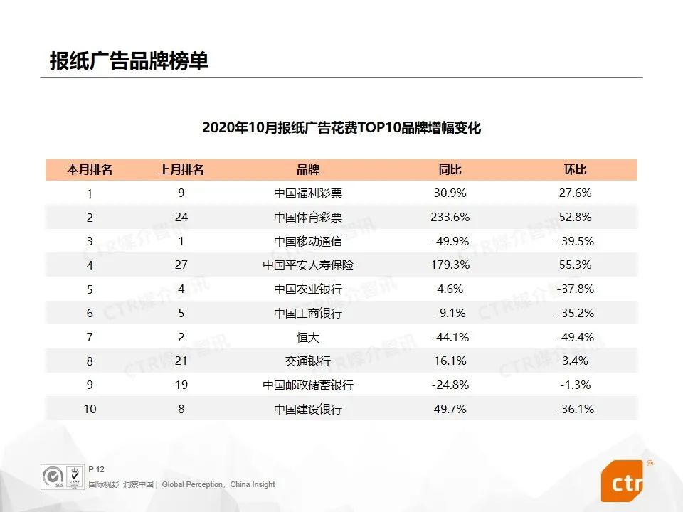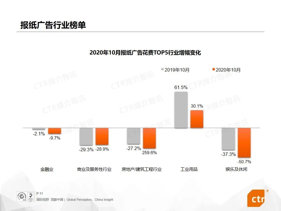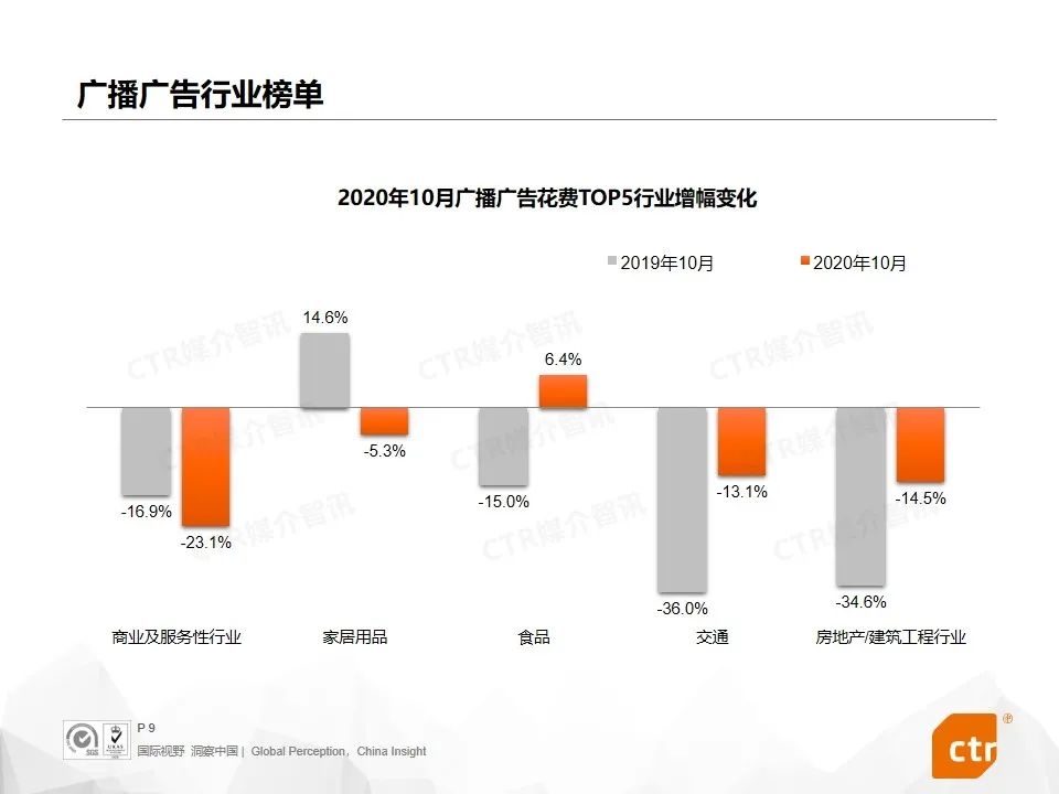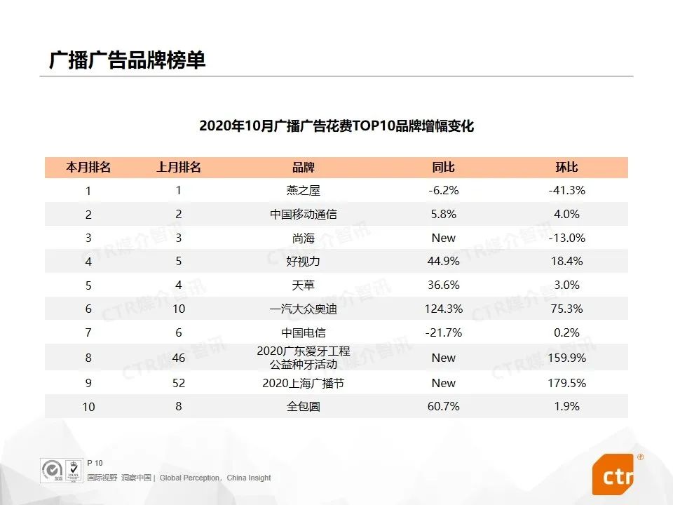 根据CTR媒介智讯的数据显示,2020年10月广告市场花费同比和环比迎来双增长,同比提升10.1%,环比提升5.8%。这是继9月份同比环比达到双增长之后,第二个月呈现增长趋势。其中,多个广告渠道表现良好,电视广告同比提升4.4%,传统户外广告同比增长7.3%,电梯广告花费同比增长均超过40%,影院广告随着全国影院的逐步开放,投放量同比已经回归正增长为8.0%。