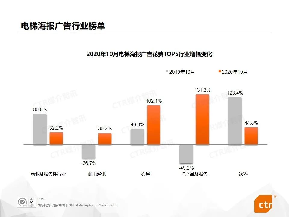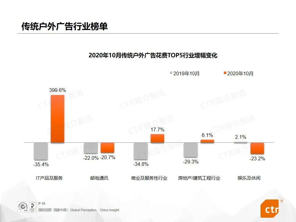 集合各类互联网品牌的IT产品及服务行业今年来增长抢眼,10月份,其在传统户外广告增幅达到399.6%,在电梯广告花费同比增长超过一倍以上,在影院广告花费同比增加326.9%。增长主要由大量的生活服务、在线教育、短视频等App集中投放拉动,如作业帮、斑马AI课、支付宝、易车、西瓜视频等。