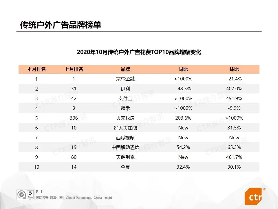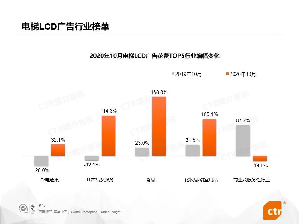 从行业表现来看,10月份,食品、饮料、邮电通讯和IT产品及服务行业在多渠道广告花费同比提升。天猫、京东、苏宁等品牌预热双十一购物节投放大量广告在户外渠道,其中,天猫在电梯广告的投放环比增长超过十倍以上,苏宁在电梯海报广告同比增长304.3%。