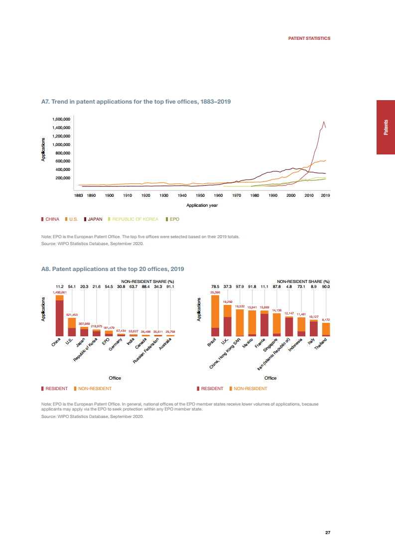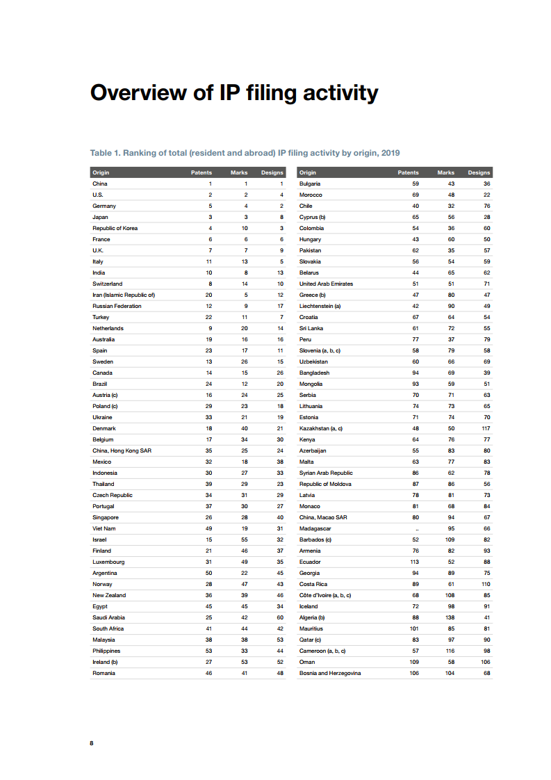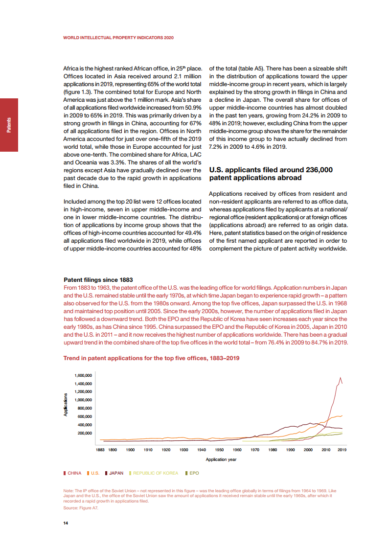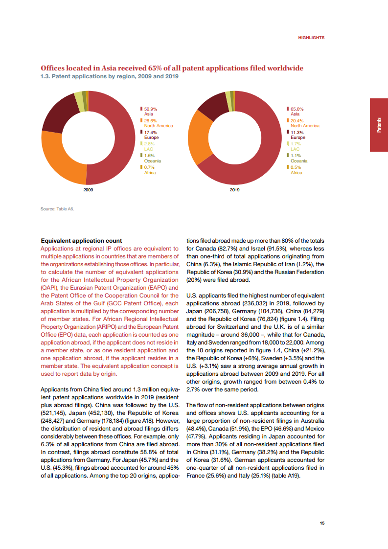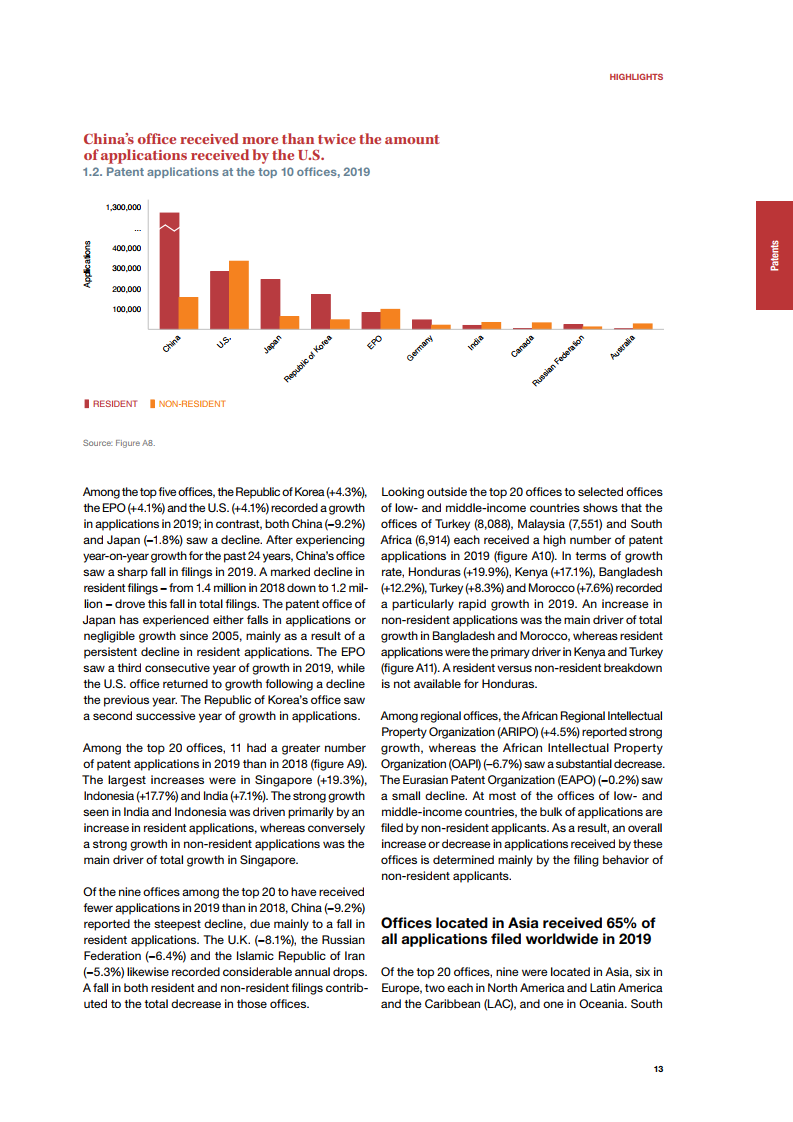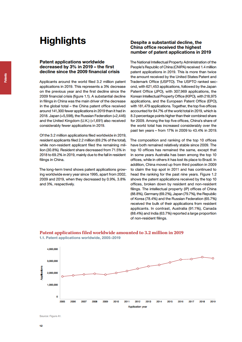 2019年中国专利申请数量为140万件,位居世界第一,是专利申请第二大国美国申请量(62.15万件)的两倍以上。排在美国之后的是日本(30.8万件)、韩国(21.9万件)和欧洲(18.15万件)。这前5名的专利申请数量合计占世界总量的84.7%。中国作为知识产权强国,其专利申请量近24年来首次出现下降,主要原因是中国实行了旨在优化申请结构和提高申请质量的整体监管转型,从而导致其申请量有所下降。