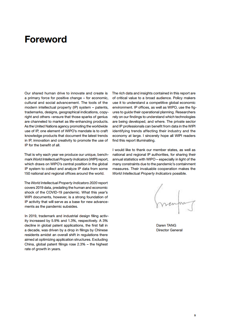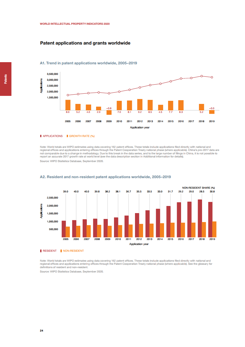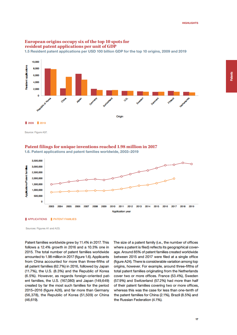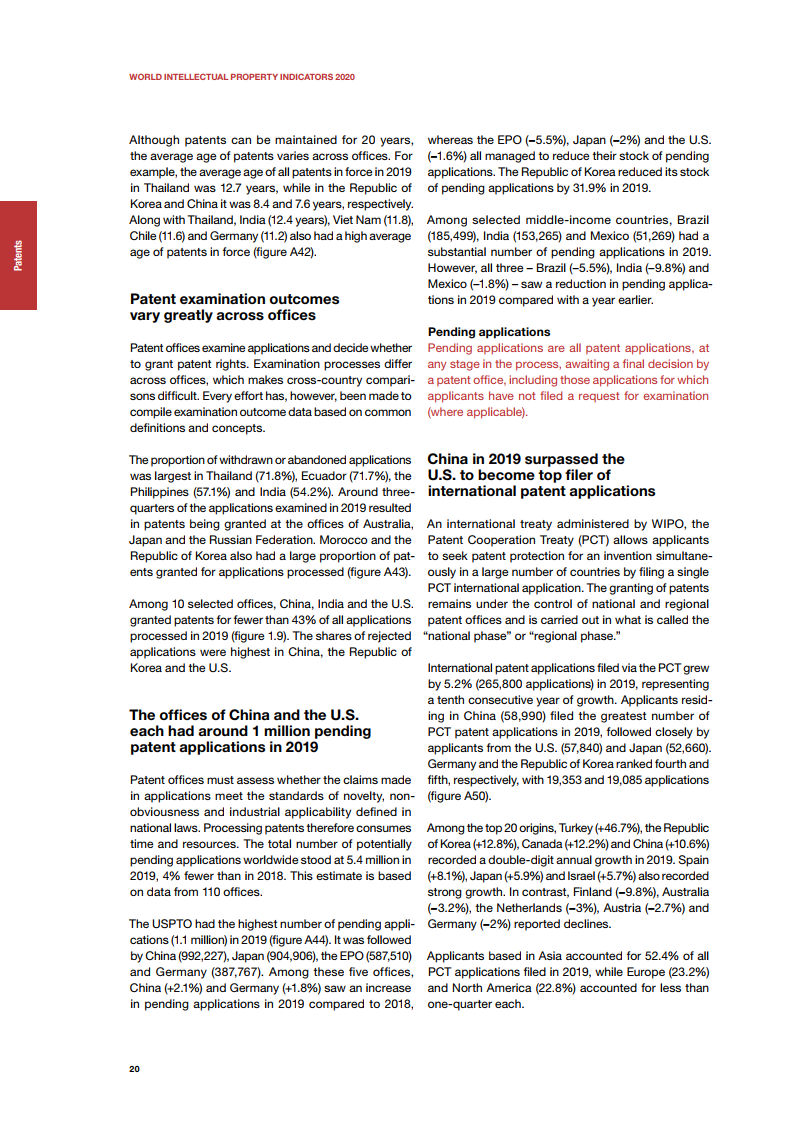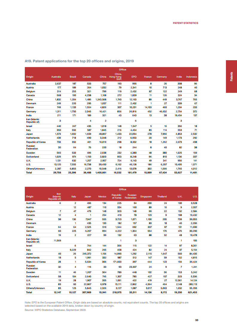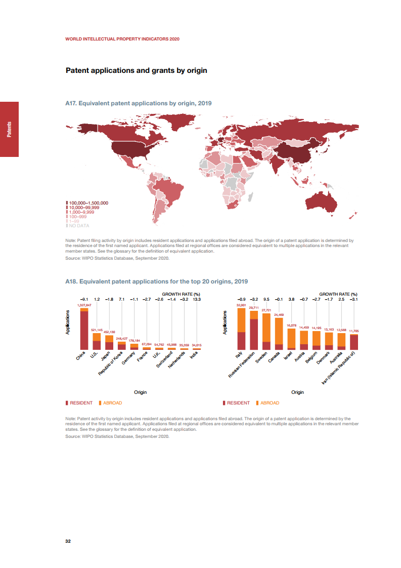 2019年中国专利申请数量为140万件,位居世界第一,是专利申请第二大国美国申请量(62.15万件)的两倍以上。排在美国之后的是日本(30.8万件)、韩国(21.9万件)和欧洲(18.15万件)。这前5名的专利申请数量合计占世界总量的84.7%。中国作为知识产权强国,其专利申请量近24年来首次出现下降,主要原因是中国实行了旨在优化申请结构和提高申请质量的整体监管转型,从而导致其申请量有所下降。
