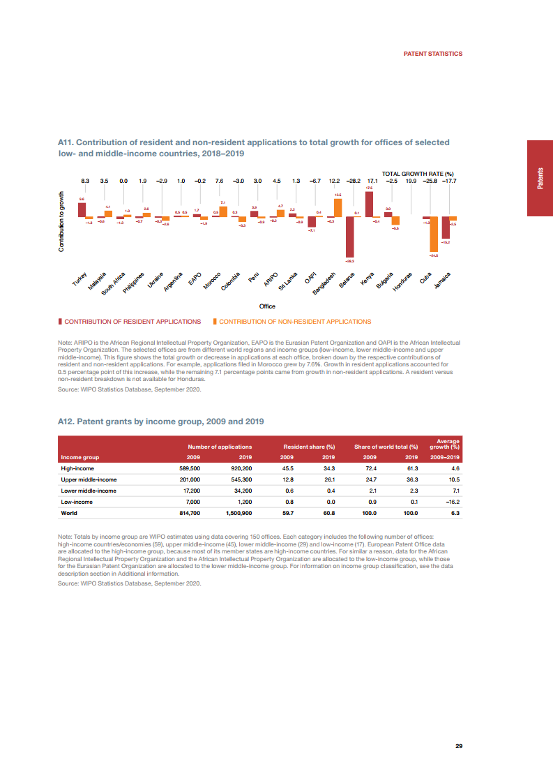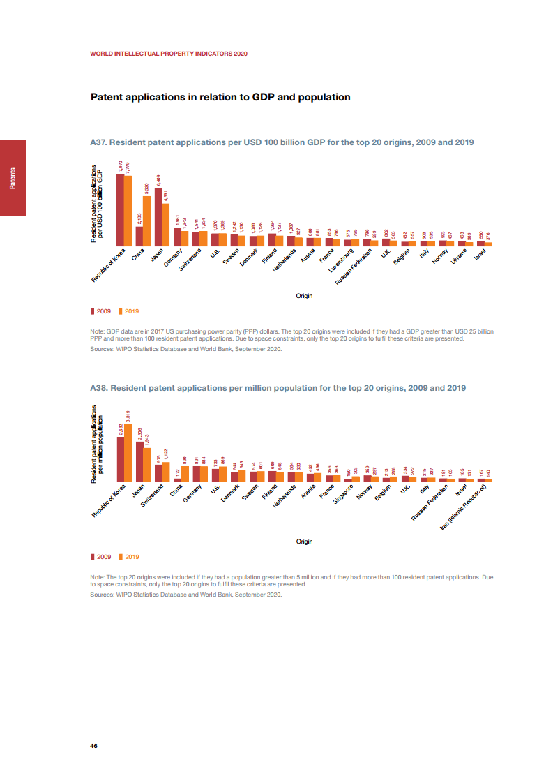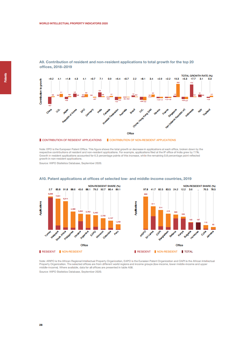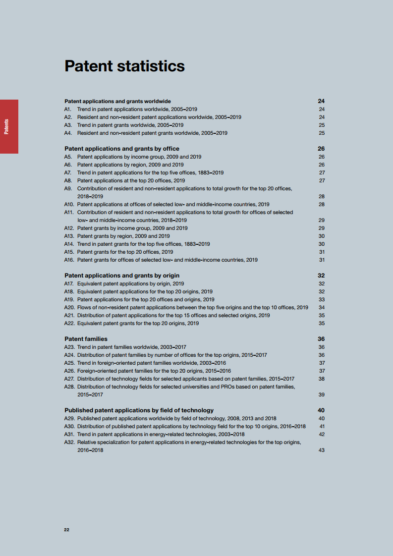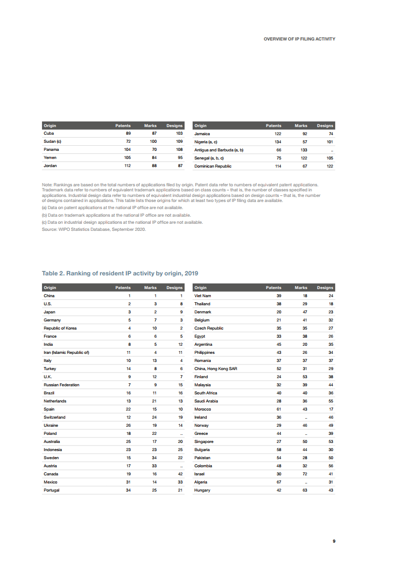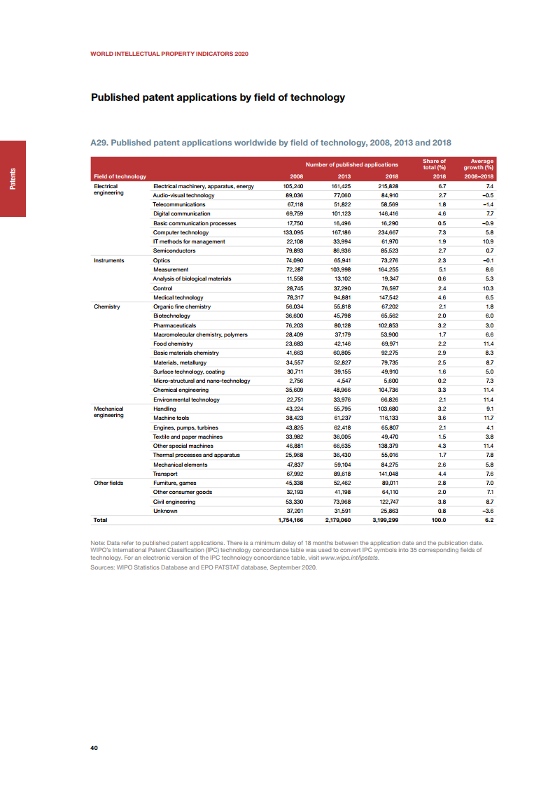 2019年中国专利申请数量为140万件,位居世界第一,是专利申请第二大国美国申请量(62.15万件)的两倍以上。排在美国之后的是日本(30.8万件)、韩国(21.9万件)和欧洲(18.15万件)。这前5名的专利申请数量合计占世界总量的84.7%。中国作为知识产权强国,其专利申请量近24年来首次出现下降,主要原因是中国实行了旨在优化申请结构和提高申请质量的整体监管转型,从而导致其申请量有所下降。