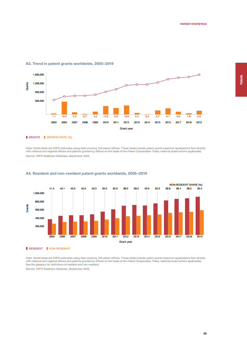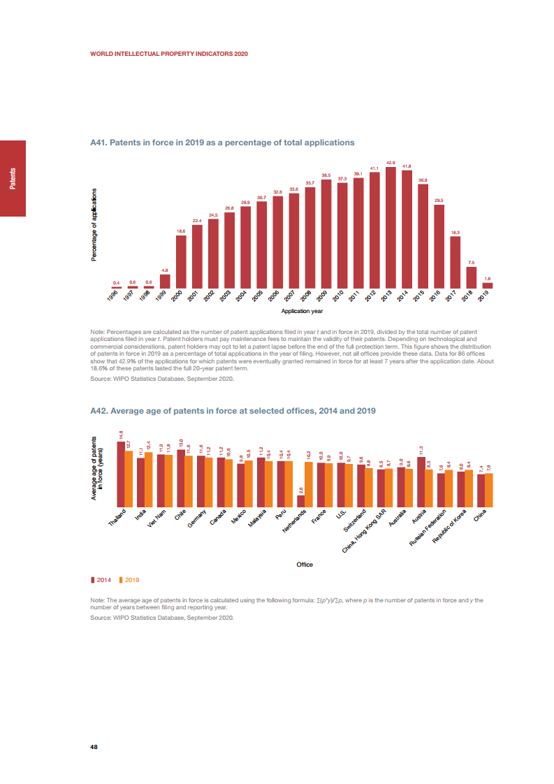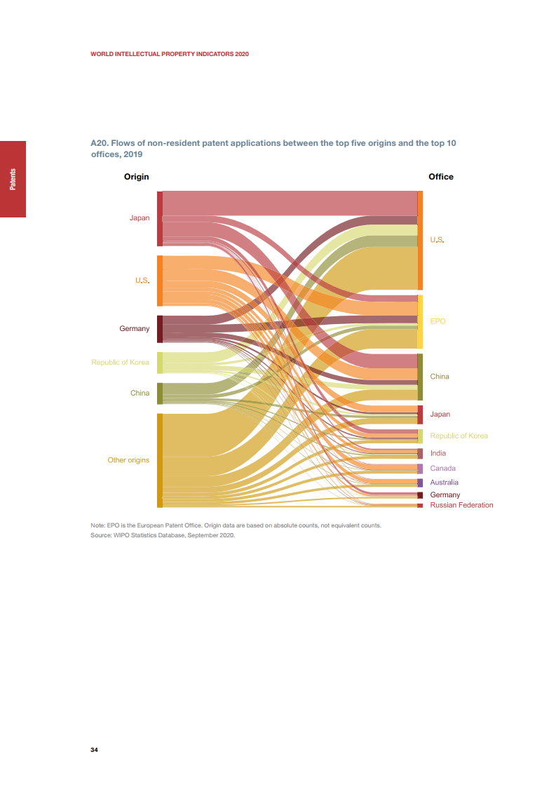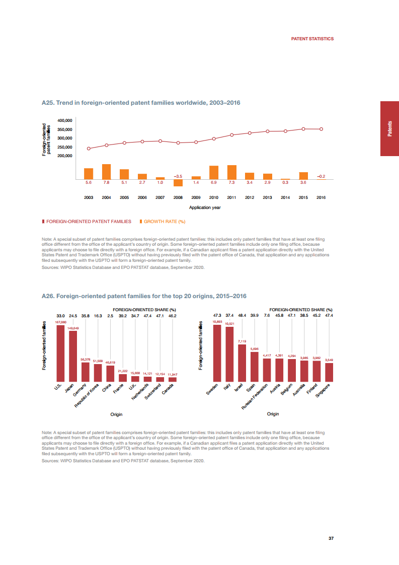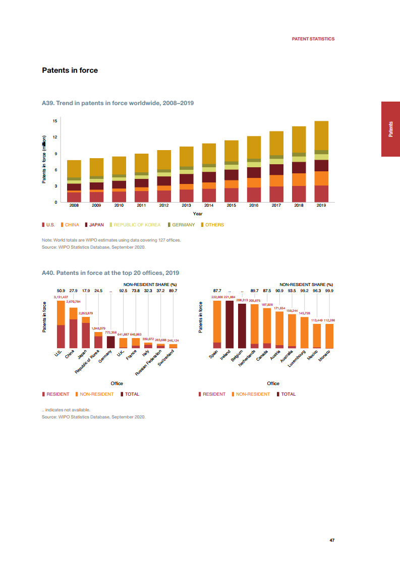 2019年全球有效专利增长了7%,达到约1500万件。美国拥有有效专利数量最多(310万件),排在其后的是中国(270万件)和日本(210万件)。美国超过一半的有效专利来自国外,日本国内的有效专利约占80%。