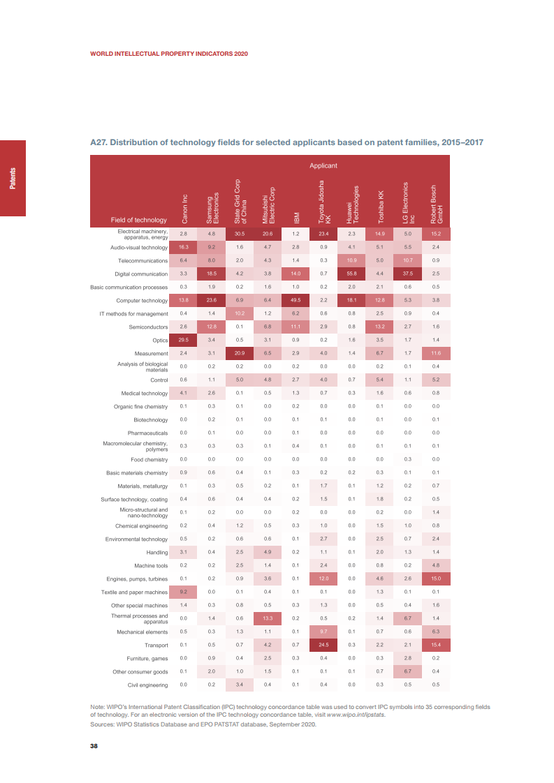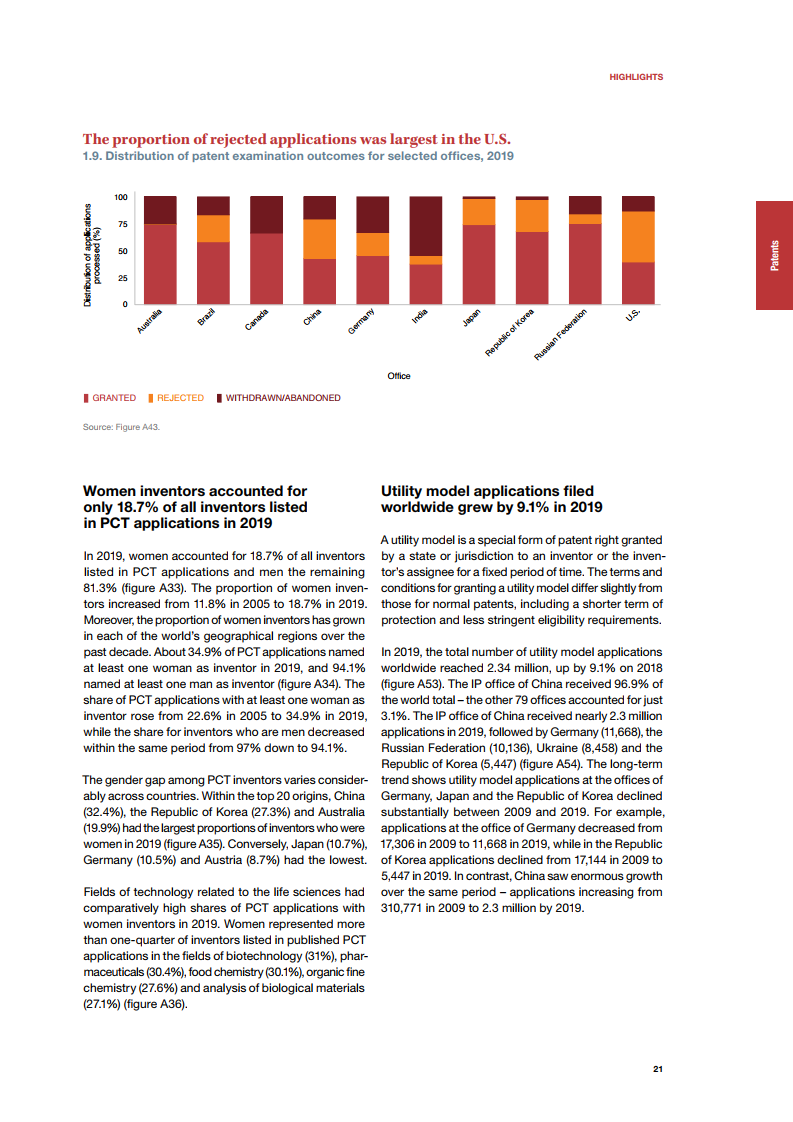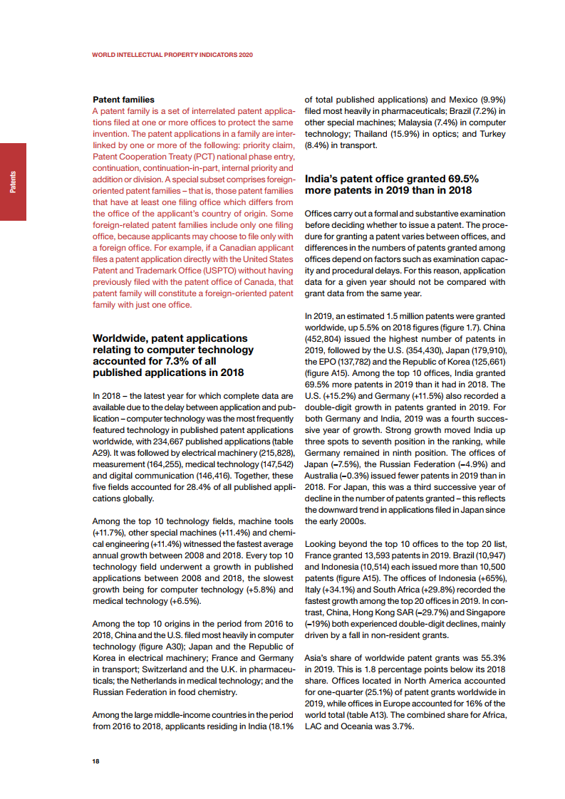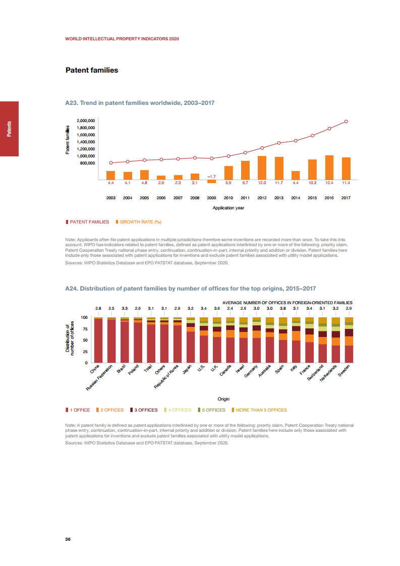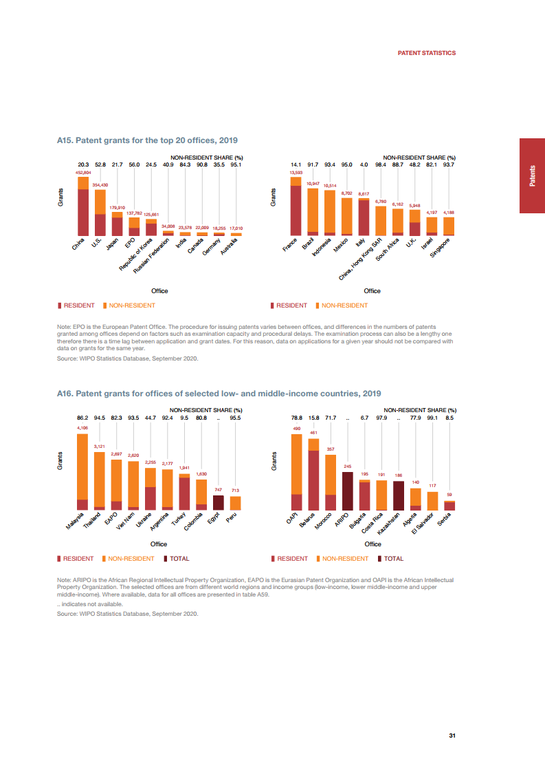 2019年全球有效专利增长了7%,达到约1500万件。美国拥有有效专利数量最多(310万件),排在其后的是中国(270万件)和日本(210万件)。美国超过一半的有效专利来自国外,日本国内的有效专利约占80%。