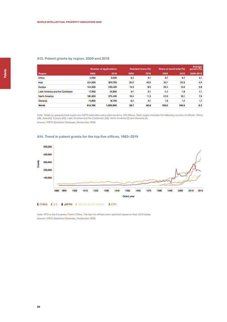 2019年,亚洲专利申请量占世界总量的近三分之二(65%),这与2009年亚洲50.9%的占比相比增幅显著,主要得益于中国经济长期增长的推动。北美专利申请量仅略高于2019年世界总量的五分之一(20.4%),欧洲占比略超十分之一(11.3%)。非洲、拉美和加勒比地区以及大洋洲的份额合计占2019年全球总量的3.3%。