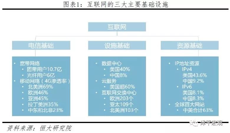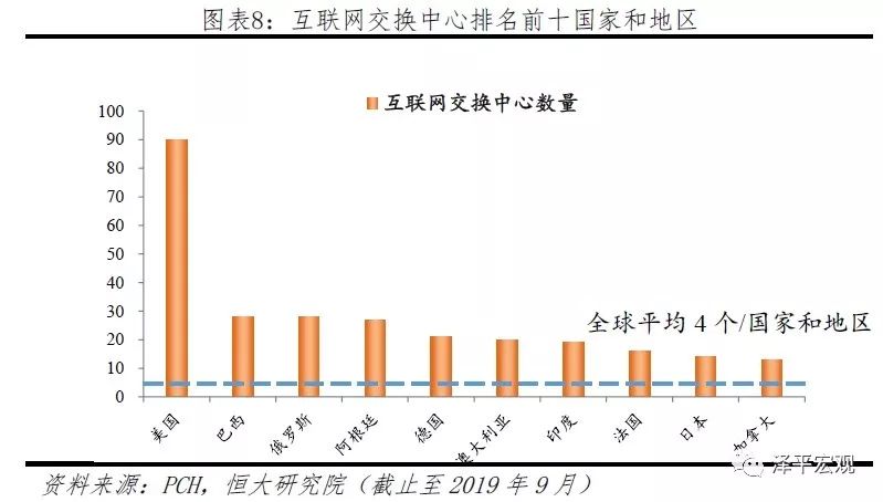 随着联网用户增多,以数据中心为代表的存储设备、以云服务为代表的应用平台、以互联网交换中心为代表的交换设施成为关键。从设施数量、服务能力、技术实现度、市场渗透率等来看,截止2018年年底,美国拥有数据中心172座、云市场占比超60%、活跃交换中心90个,均为世界第一。此外,以微软、思科、惠普等为代表的美国企业垄断核心软件和硬件供应。中国发展迅速,目前拥有数据中心35座、云市场占比超4%、活跃交换中心8个,但由于业务主要集中大陆市场、部分领域被国企垄断缺乏竞争,具有局限性,与美国仍存在较大差距。