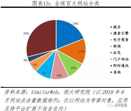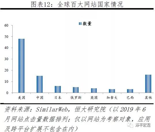 2019年全球百大网站集中中美两国,侧重娱乐和搜索属性,总量占比超30%。以网站月度浏览量为考察对象,选取2019年全球前100网站分析:从国家来看,中美两国网站总量占比过半,达到63%;从网站类型来看,以Youtube、Netflix为代表的娱乐型网站数量19家排为第一;搜索引擎方面,除了中国市场(百度、搜狗)和俄罗斯市场(Yandex),谷歌垄断全球搜索引擎市场,包括美国、巴西、法国、意大利等,其中美国谷歌以604.9亿月度浏览量排为第一。