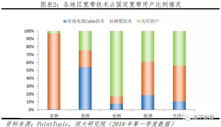 光纤宽带占比持续提高,中国光纤宽带用户占比超越全球平均达90%。宽带网络技术经历拨号上网、ADSL(Modem猫)、有线电缆到光纤FTTH转变,光纤网络的实施进一步提升网络传播质量、缩短传输时间。截止2018年年底,全球光纤用户超6亿。从国家和地区来看,东亚地区光纤发展程度最高,其中中国以3.7亿用户数、90.4%固定宽带用户占比遥遥领先。其次,俄罗斯光纤网络发展较为迅速,光纤用户占固定宽带用户比例超60%。由于美国侧重有线电缆cable技术、英国德国等欧洲地区侧重铜缆技术,光纤网络有待发展。