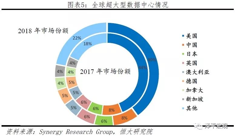 美国汇聚全球超大型数据中心,但资源优势逐年减弱。2018年全球超大型数据中心共计430个,同比增加11%,增长主要来自亚洲地区。从国家和地区来看,美国保持第一占比达40%,但多年呈下滑趋势,较2016年下滑5个百分点。中国大型数据中心增长较快,占比8%,但与美国仍有较大差距。