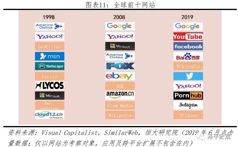 对比1998至今的三十多年发展,网站服务更多元,竞争也更残酷。1998年,由于技术处于发展初期,商业模式和产品服务尚在摸索,全球网站提供简单的网络连接、页面导航、邮件收发等服务,模式较为单一。例如1998年排名第一的America Online,为个人用户提供拨号上网服务。2019年,全球网络建设更加完备,互联网接入服务逐渐被电信企业替代,互联网服务形式和内容产生巨大变化,搜索、娱乐、社交等成为主流。