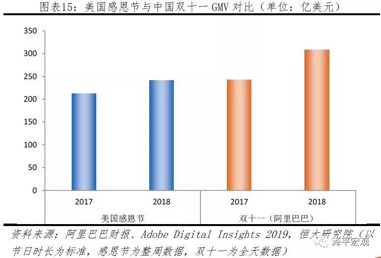 阿里巴巴(天猫、淘宝)、京东、亚马逊是该领域的主要参与者,阿里巴巴从曾经的模仿者和追赶者成为现在的领导者。为促进消费和提高销售额,东西半球均开设购物节,例如美国的感恩节和黑色星期五,中国的双十一和六二八。自2015年起,中国购物节网站成交金额(GMV)逐渐超过美国。以双十一为例,2018年天猫双十一全天交易额为2135亿元(约308亿美元),超过美国感恩节约242亿美元的销售总额。此外,亚马逊模仿双十一而开设的Prime Day,2018年销售额约40亿美元,仅为天猫双十一的七分之一。