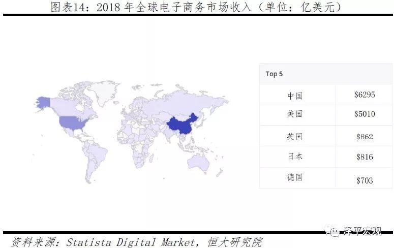 尽管美国是电子商务的发源地,中国凭借庞大的消费群体、不断完善的配套基础设施等优势,多年保持全球电子商务领域第一。2018年,全球电子商务市场营收约1.8万亿美元,从电子商务所销售的细分类别来看,前三类别依次是服装类、消费电子类和家具与家装类,收入分别为3463亿美元、3073亿美元和1999亿美元。从市场来看,中国的市场规模和同比增速均为第一,分别为6295亿美元和10.8%。美国第二,市场规模和同比增速分别为5010亿美元和7%,英国、日本、德国依次为第三、四、五名。