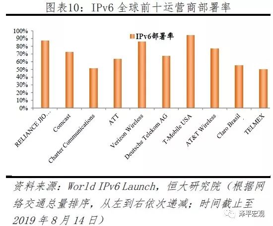 从2012年开始,全球加快IPv6地址的开发和部署,中国总量第一,但使用率不及美国。截止2019年8月26日,全球共分配IPv6地址7.2*10^16块(/64),中国以2.04*10^14块(/64)数量排全球第一,美国、德国依次为第二、第三,地址数量分别为2.0*10^14块(/64)、9.2*10^13块(/64)。从地址使用率来看,全球仅4个国家使用率超过10%,其中美国以23.5%地址通告率排为第一,德国、日本、中国通告率依次为16.4%、13%、10.7%,分别排为第二、第三、第四。(注:IPv6地址长度128位,分成64位前缀+64位接口,通常一个接口代表一个终端,因此7.2*10^16块(/64)地址代表7.2*10^16*2^64个有效地址)
