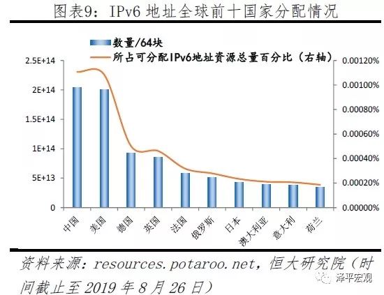 IPv4地址即将耗尽,拓宽网络容量刻不容缓。根据网络协议设定,IPv4地址共32位,全球IPv4地址最高限度为2的32次方约42.9亿个。截止2019年8月,全球IPv4地址已分配36.8亿个,其中美国拥有约16.1亿个,占已分配总量43.6%为全球第一,中国、日本拥有量依次为3.4亿个、2亿个,分别排第二、第三。