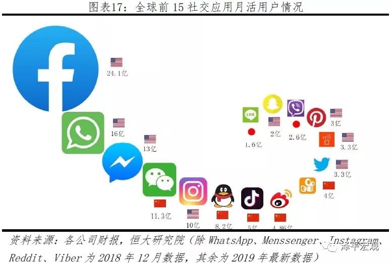 美国在社交和娱乐媒体两大类中均占有一定优势。从社交行业来看,以Facebook为核心的Facebook系社交应用构成全球最大、最广的社交网络,旗下包括Facebook、Messenger、WhatsApp、Instagram等。从月度活跃用户数量来看,Facebook公司包揽前五中的四位,其中Facebook月活用户数最高达24.1亿人,约为微信的2倍。此外,以微信、QQ、抖音、微博和快手为主的中国社交应用快速增长,但由于用户主要集中大陆市场,与美国社交应用仍有一定差距,出海能力有待加强。