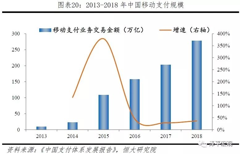支付宝、微信支付等第三方支付支撑中国移动支付快速发展。支付宝和微信支付(财付通)几乎垄断中国内地移动支付市场,截止2019年第一季度,支付宝和微信支付合计市场占比达92.6%。从用户人数来看,支付宝全球用户达12亿人、微信超9亿人,同期Paypal仅2.9亿人。