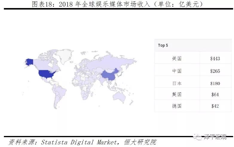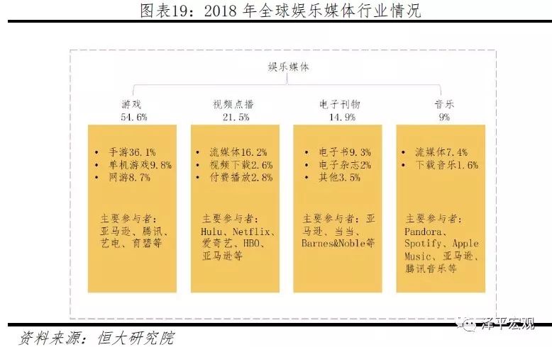 从娱乐媒体行业来看,2018年全球娱乐媒体市场收入约1417亿美元,美国以443亿美元排为第一,中国、日本、英国和德国依次为第二、三、四、五名。从细分市场来看,游戏类和视频点播类成主要战场,其中又以手机游戏(移动游戏)和视频流媒体占主导,2018年收入分别为511亿美元和230亿美元。从参与者类型来看,可以主要分为内容制作者(例如Netflix、艺电、腾讯等)和渠道销售商(亚马逊、腾讯、当当等)。由于高度成熟的娱乐工业基础和“好莱坞基因”,欧美娱乐媒体内容制作全球领先,例如全球热播的《权利的游戏》。依靠BAT等互联网企业扶持,中国的渠道销售能力突出,但依然需要考虑版权和政策监管方面的问题。