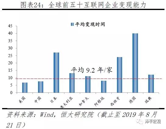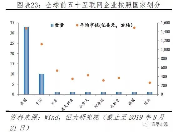 与其他国家和地区对比,中美互联网企业有三大共同特征:成立时间短、上市快、市值高。从企业成立时间来看,前五十企业中2007年以后成立的互联网企业共12家,均来自中国和美国,分别为3家和9家,中美企业更年轻。从变现能力来看,美国和中国企业成立至上市时间最短,分别为6.8年/家和7.5年/家,远低于整体平均变现时间9.2年。从企业市值来看,德国企业市值最高,平均达1489.4亿美元,美国、中国企业排第二、第三,分别为1477.4亿美元/家、1122亿美元/家。