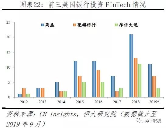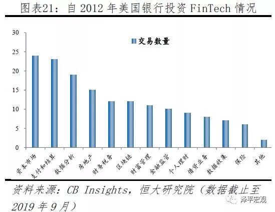 美国更擅长个人理财、资本市场服务等领域。2018年,美国金融科技领域的个人理财市场规模约中国的5倍。相比中国以互联网企业为核心而开展支付、借贷等金融服务,美国更倾向借助传统银行的力量发展金融服务。从金融科技领域的投资情况来看,从2012年至2019年9月,美国银行共发起158起投资事件,高盛、花旗和摩根大通为前三银行,分别进行了72起、46起和30起投资。此外,美国金融科技涉及领域广,其中资本市场、支付和清算、数据分析一直是美国金融科技关注重点,但从2019年开始的投资事件来看,房地产、财富管理受到更多青睐。