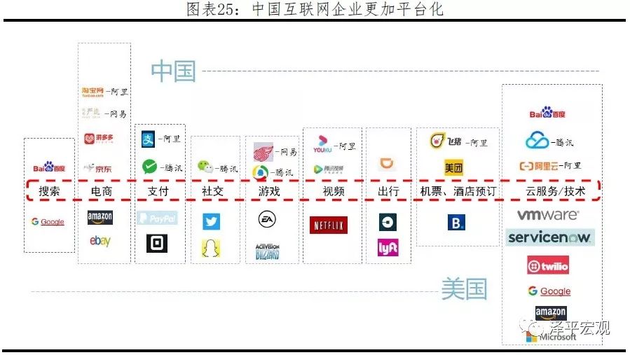 由于互联网人口红利逐渐消失、运营单一项目的用户回报率和留存率较低、跨界融合展现“1+1>2”效应,全球互联网企业纷纷趋向平台化和生态化,且企业影响力愈大,该趋势愈明显。Top5公司微软、亚马逊、谷歌母公司Alphabet、Facebook、阿里巴巴均表现出该特点。详细来看,中国互联网企业的平台化趋势更明显,包括传统龙头企业BATJW(百度、阿里巴巴、腾讯、京东、网易)和新生代企业美团点评、拼多多,以及尚未上市的蚂蚁金服、字节跳动和滴滴出行。美国既有如亚马逊、谷歌母公司Alphabet等平台型巨头,也有不少细分领域的“隐形冠军”,例如游戏领域的动视暴雪、Electronic Arts,云服务和技术领域的VMware、Twilio等;中国各个细分领域基本被平台型巨头垄断。