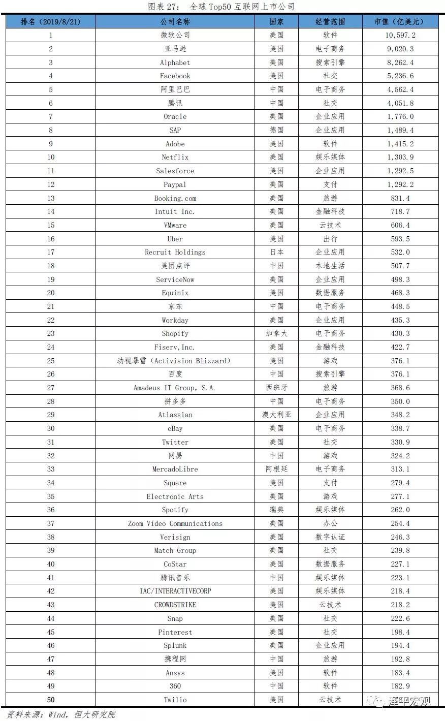 附录:全球Top50互联网上市企业(按市值排序,截止至2019年8月21日)