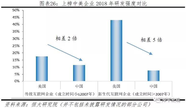第二,美国企业更依靠科技驱动,中国企业更依靠用户转化。美国互联网技术发展水平较高、城市发展较为均衡、网民渗透率趋于饱和,初创企业资本实力、商业模式、人才资源均无法与现有巨头抗衡,只有在某一领域加强研发投入,尚能维持竞争力。美国新生代企业(成立时间晚于2007年)平均研发强度是传统互联网企业的2倍之多,达43.1%。与美国对比,中国各个城市和地区经济发展水平更不均衡,网民渗透率为59.6%、与美国相差约20个百分点,导致网民接触网络产品和服务的时间、程度参差不齐,因此各大互联网企业从一二线城市“下沉”至三四线城市,对新用户和流量进行抢夺。此外,由于中国互联网企业具有强平台属性,往往倾向于增加平台内各个场景的导入进行现存用户的二次、三次利用转化。目前中国互联网企业研发强度呈下滑趋势,新生代互联网企业平均研发强度约为传统互联网企业的二分之一。