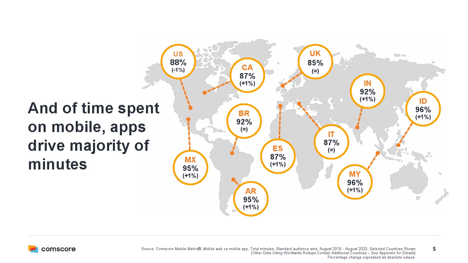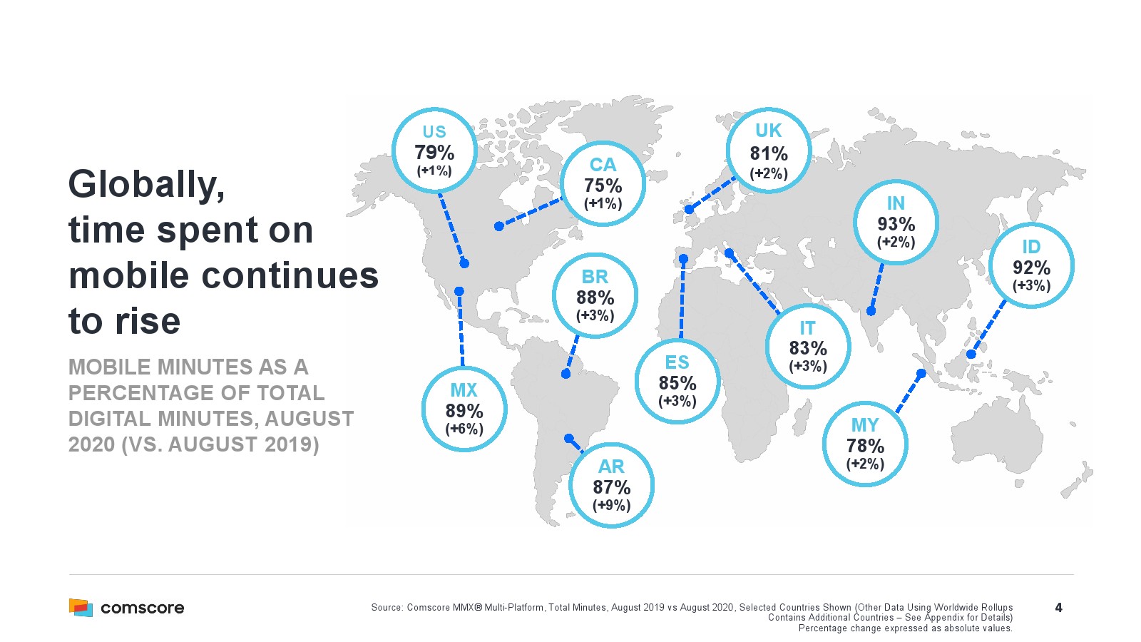 - 在全球范围内,移动设备使用量仍在增加。 2020年8月,美国人在线时间的79%花在移动设备上,高于2019年8月(78%)。同时,墨西哥人将89%的在线时间花在移动设备上。印度人更钟情于移动设备,占在线时间的93%。
