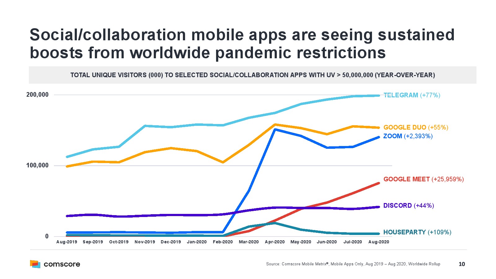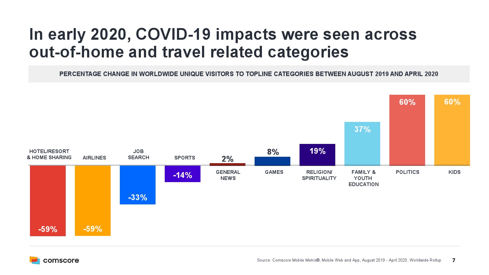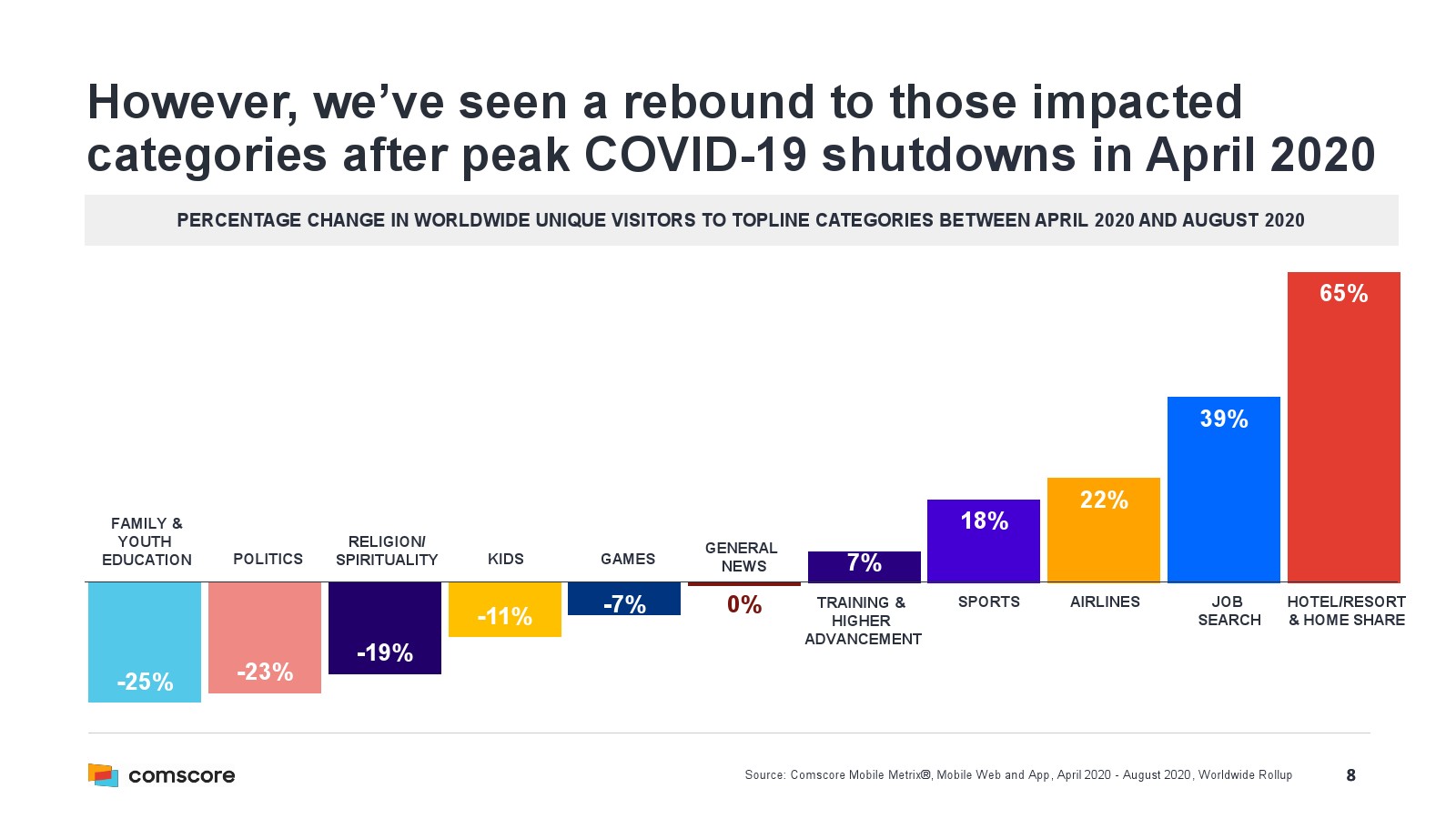 由于大流行和随后的封锁,消费者将更多的时间花在移动设备上。2020年4月达到顶峰时,观众将注意力转移到了更多本地问题上,例如政治,从2019年8月到2020年4月,独立访客人数增加了60%。但是,2020年4月至2020年8月之间有些行业开始反弹:酒店/度假村和家庭共享的访客数量从2019年8月到2020年4月减少了59%,但从2020年4月到2020年8月增加了65%。