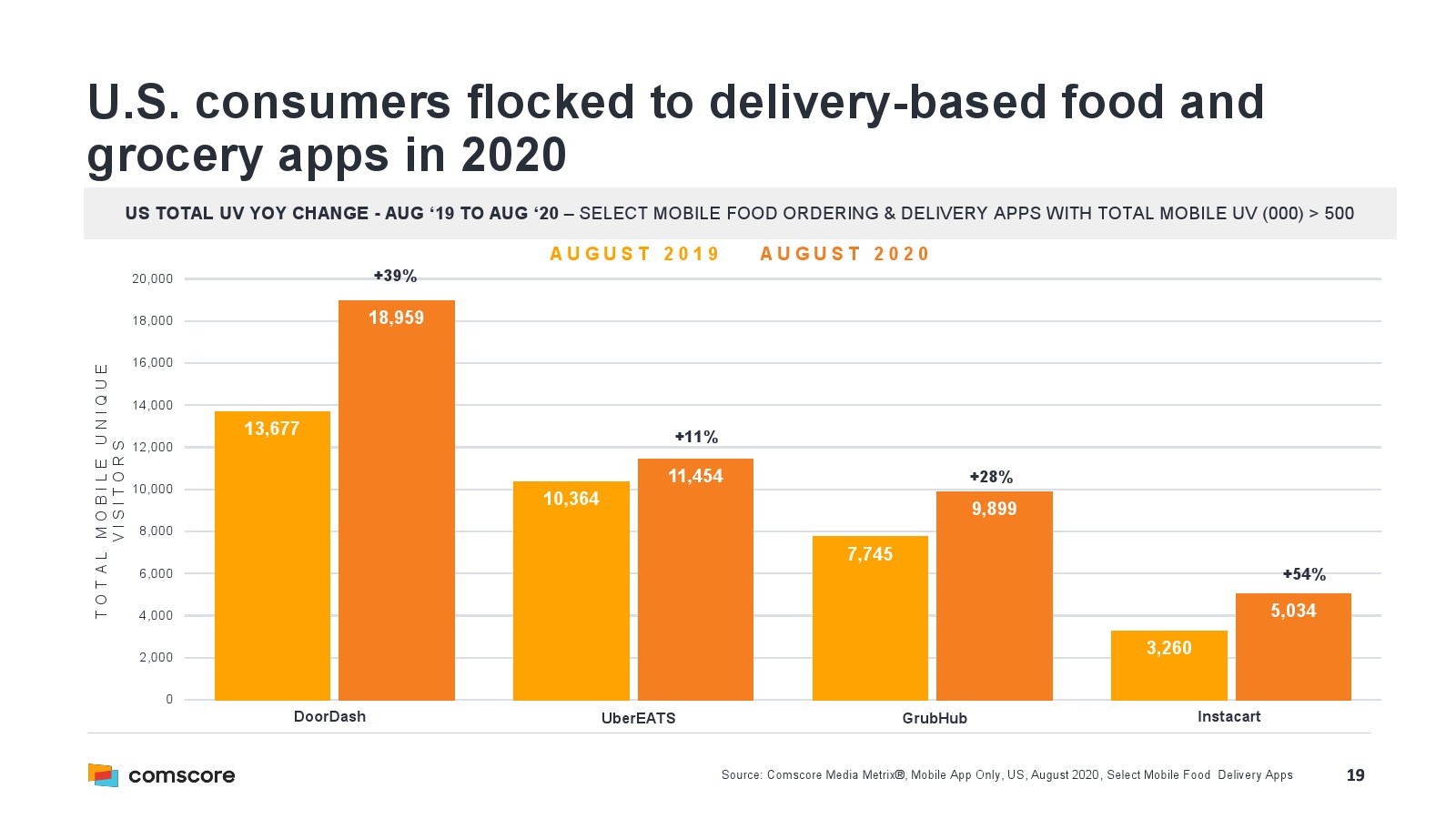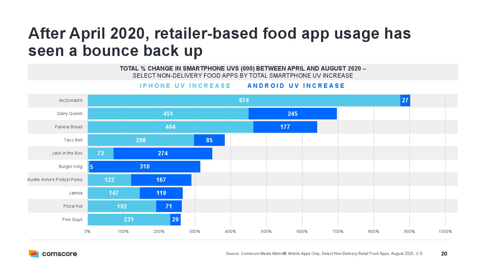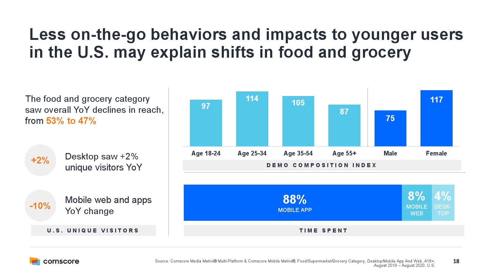 由于大流行和随后的封锁,消费者将更多的时间花在移动设备上。2020年4月达到顶峰时,观众将注意力转移到了更多本地问题上,例如政治,从2019年8月到2020年4月,独立访客人数增加了60%。但是,2020年4月至2020年8月之间有些行业开始反弹:酒店/度假村和家庭共享的访客数量从2019年8月到2020年4月减少了59%,但从2020年4月到2020年8月增加了65%。