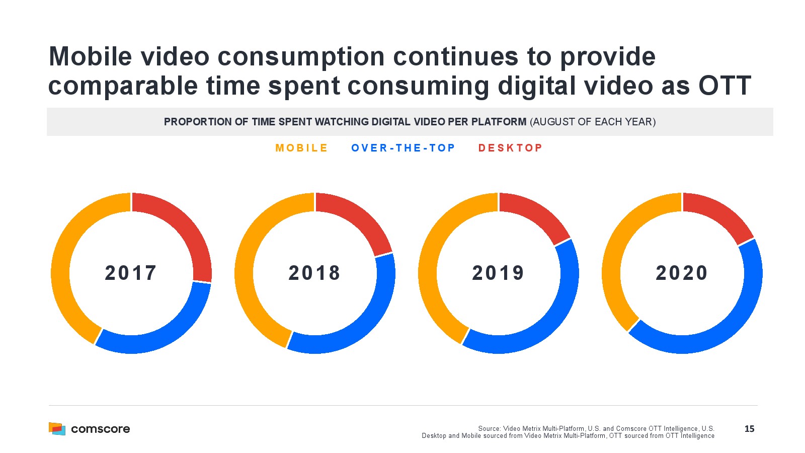 而且,美国各地的移动视频消费量也在增加。从2017年8月到2020年8月,在移动设备上观看视频的总时间增加了65%。移动视频的增长实际上超过了PC,后者同期增长了21%。预计移动视频将在未来几年保持其强大的地位。
