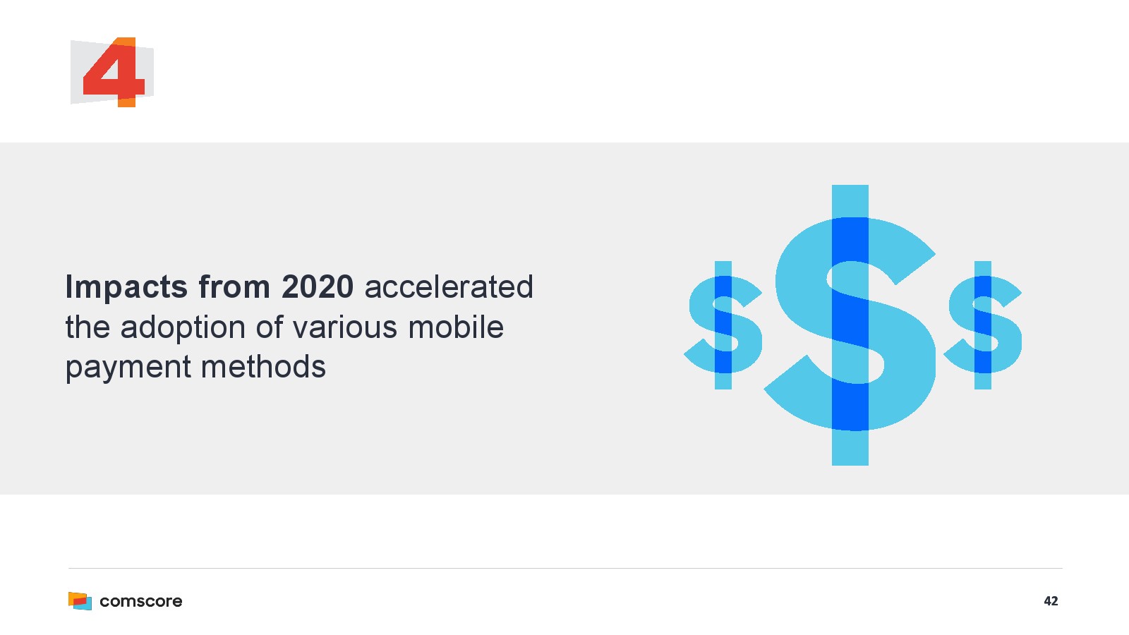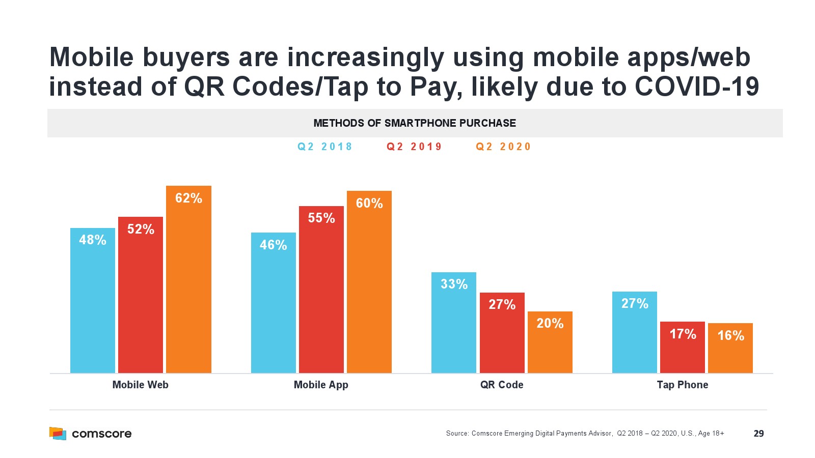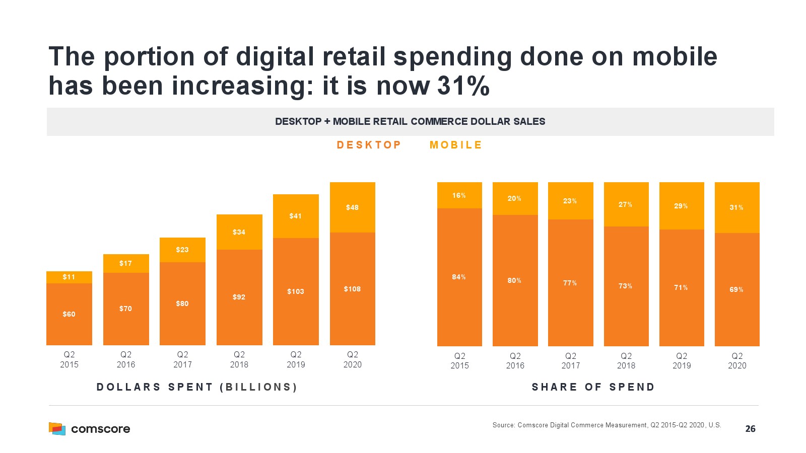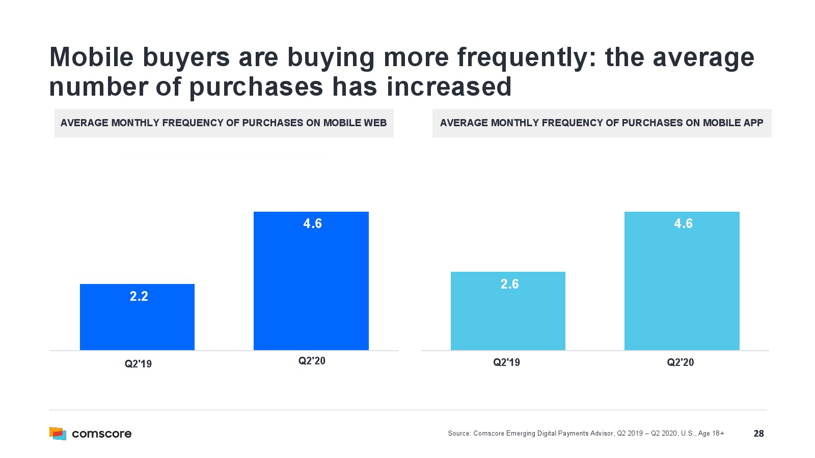 - 2020年第二季度,美国移动零售销售额占网络零售销售额的比例从2015年第二季度的16%增长到31%。移动购物者的购买次数也越来越多,平均购买次数从2019年第二季度的2次增加到2020年第二季度的4.5次。