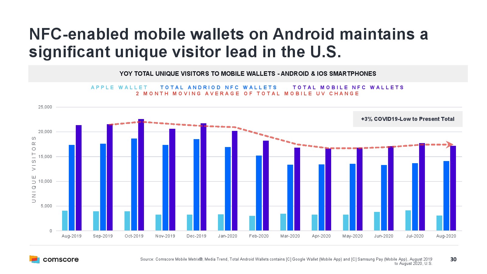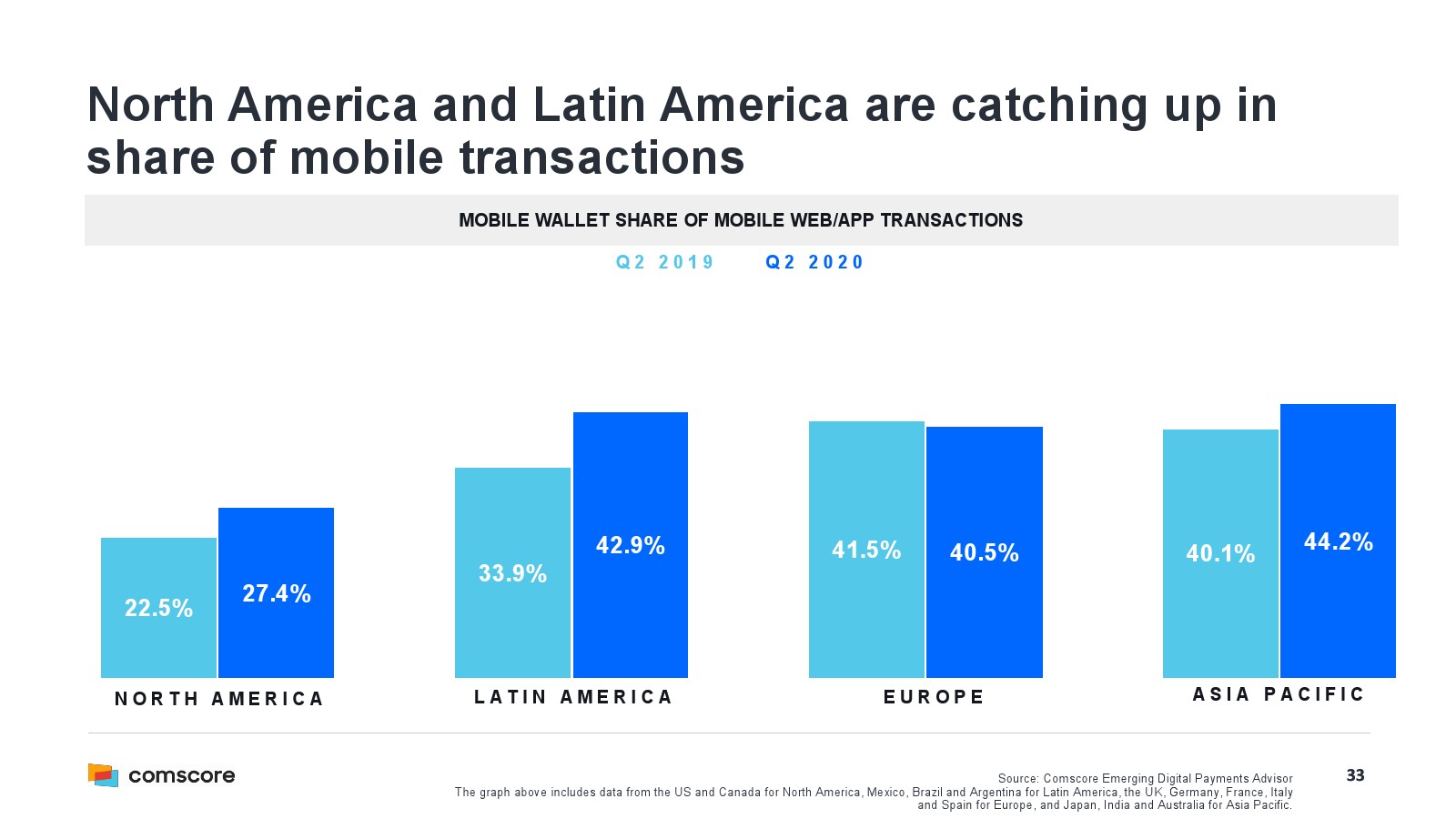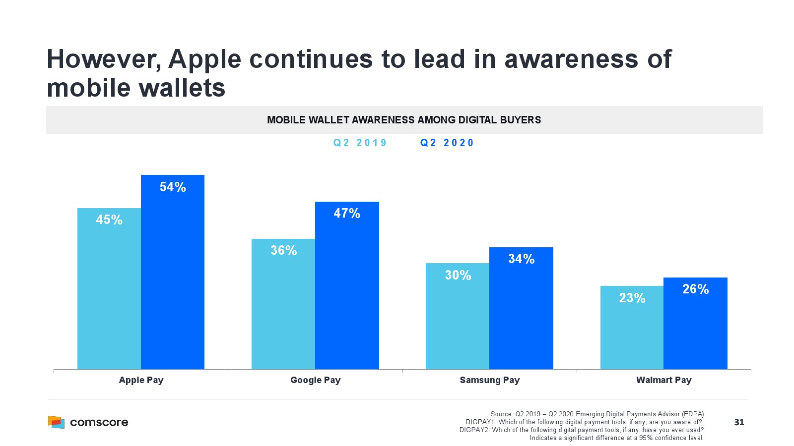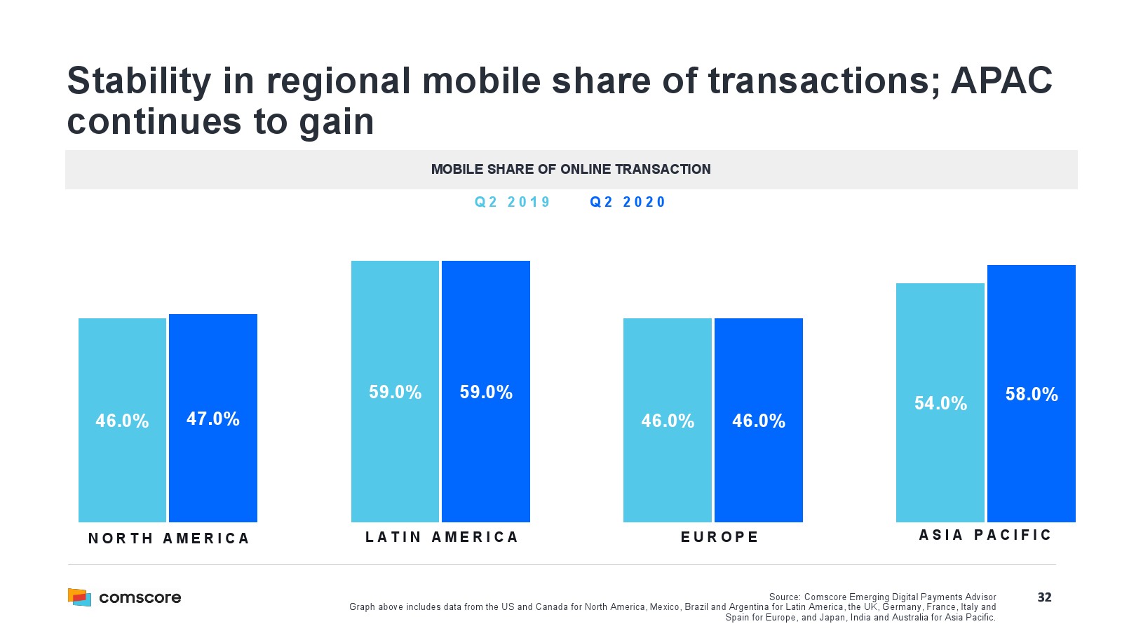 - 2020年第二季度,美国移动零售销售额占网络零售销售额的比例从2015年第二季度的16%增长到31%。移动购物者的购买次数也越来越多,平均购买次数从2019年第二季度的2次增加到2020年第二季度的4.5次。
