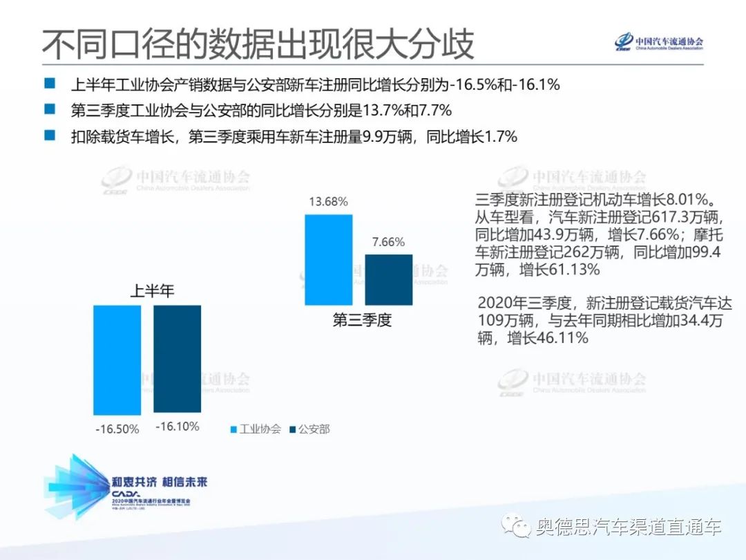 从三季度数据来看,汽车的产销是13%以上的正增长,公安部新车的注册合计的数据按照结构拆分,拆分出7、8、9月份的数据同比只有7.6%,与工业协会的数据相差了6个百分点。