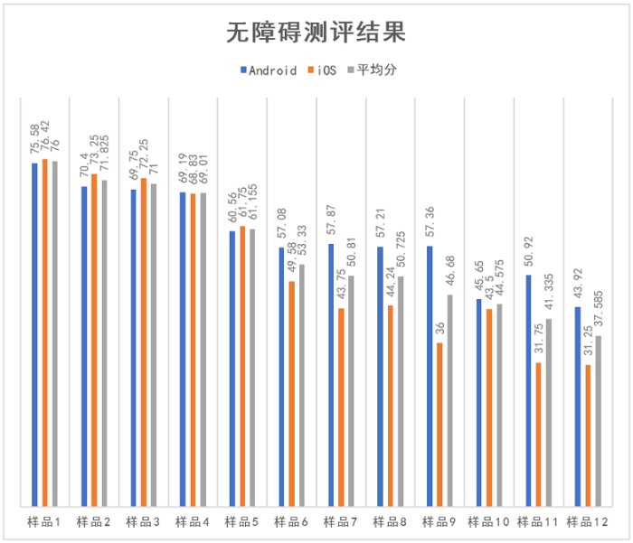 根据《报告》显示,Android端12款金融App最高得分75.58分,最低得分43.92分。iOS端12款金融App最高得分76.42分,最低得分31.25分。